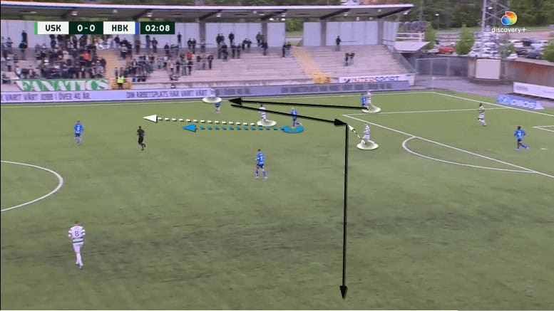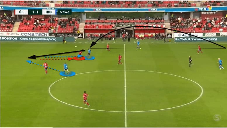 This illustrates how effective having two forwards playing up against centre-backs can be. Within seconds of winning the ball back, a long ball and simple movements from the forwards have Halmstad in behind the opposition’s backline.