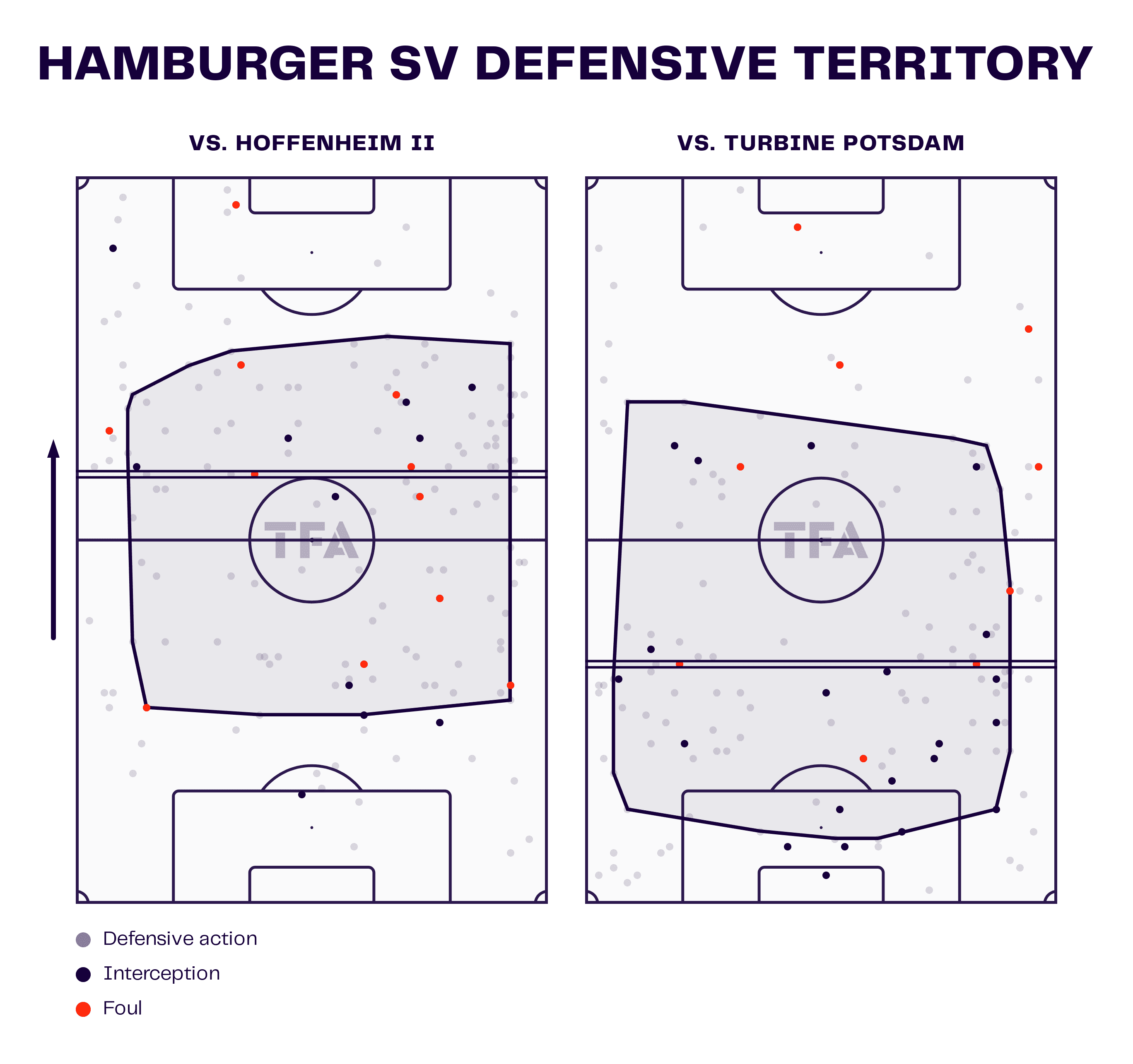 This diagram further illustrates the versatility that Hamburger possesses in defensive strategies. In the game against Hoffenheim II, they looked to dominate the field position and regain the ball high up the field. In the game against Turbine Potsdam, they generally sat deeper, looked disciplined in their shape, and waited for opportunities or mistakes where they could pounce and regain possession.