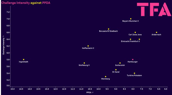 However, that doesn’t apply to Hamburger, who again sits relatively in the middle of the row with a PPDA of 8.01, which puts them in fifth place in the division. Then, regarding challenge intensity, they have a rate of 5.8, which puts them in sixth place. So, although in the top half of both categories, they are by no means clearly leaning in one direction.