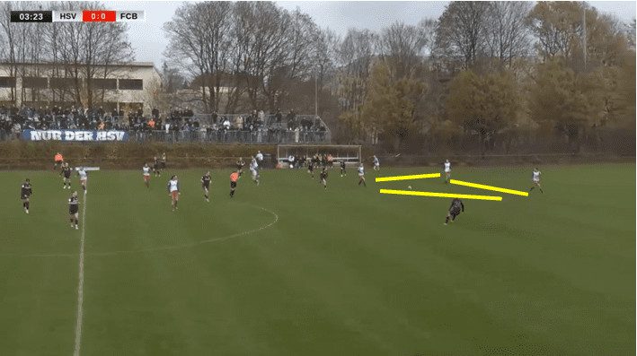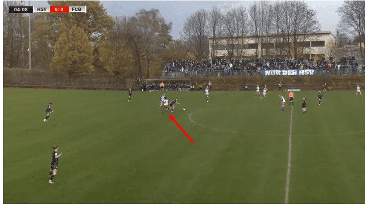 Here, you can see how they look to enclose the central area, with both wingers playing more advanced than the two central midfielders. Then as the ball is played towards the midfield the left winger, Baum, puts back side pressure on the Bayern player this forces her to turn away and into the midfield area where Hamburger have players blocking passing lanes. Thus manipulating Bayern to attack down their left flank and being able to control them despite still defending.