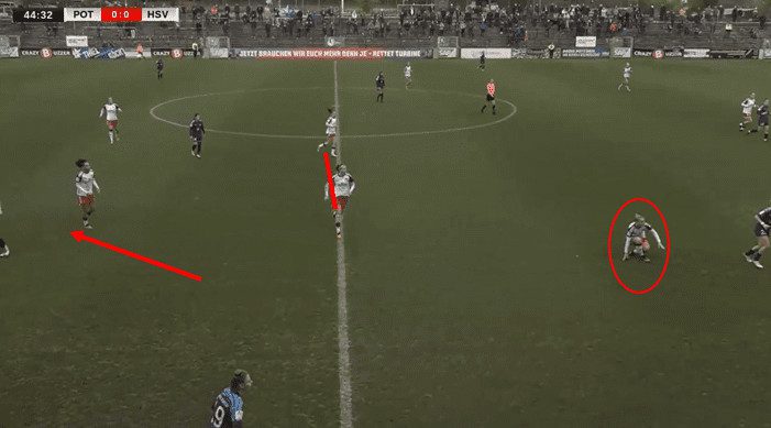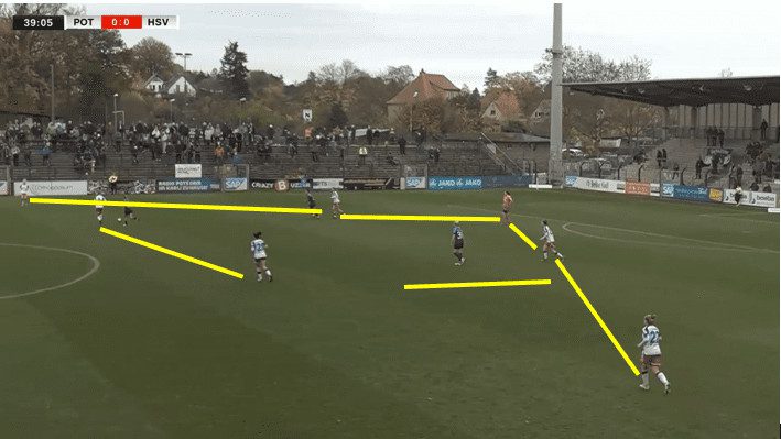 In this example, against Potsdam, they are playing with that midfield three, with Stoldt playing as that screen in front of the backline. Additionally, instead of having the front two, the ball-side winger will step up to press the defender if engaged.