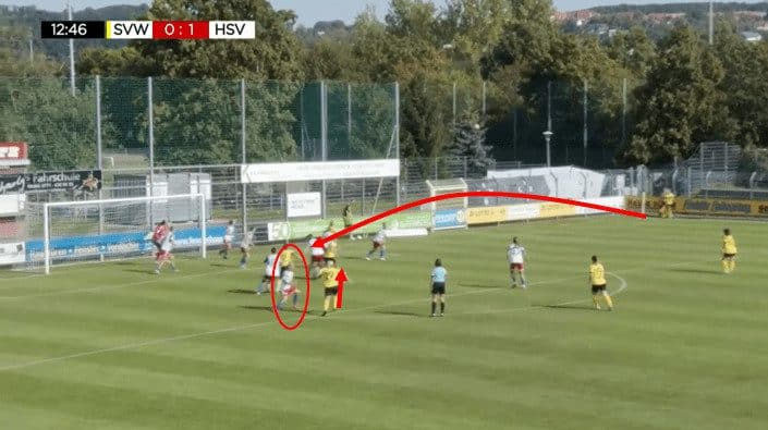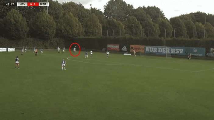 This example comes from a throw-in, but again, the defensive shape lets down the Hamburger side. With central defender Emilia Hirche allowing the forward to roll her and get in behind her, this results in a goal for the Meppen forward. What should have happened is she put pressure on the Meppen player from the goalside and prevented her from turning and having a clear path to the goal.