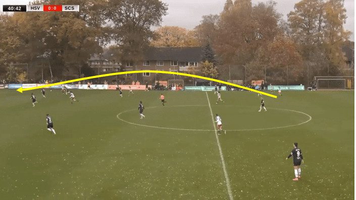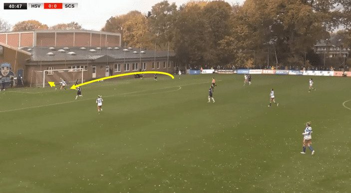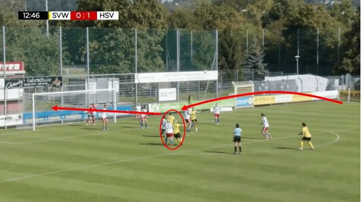 Here, in this example, what you have is right central defender Marlene Deyß playing a long forward ball over the top for the right winger on the day, which was Schulz. She played a right-footed ball behind the opposition’s defensive line, which resulted in a tap-in for Larissa Mühlhaus on the back post.