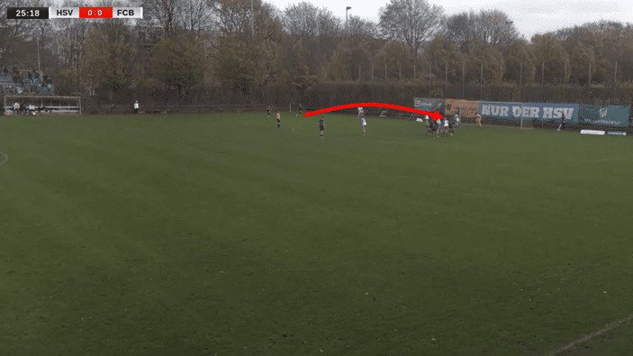 In this example, opponents Bayern II have a wide freekick. Hamburger actually deals with the first ball, but the issue lies in the second wave, with all eleven players just standing still and watching as the ball is in the air for about half a second, and they all fail to react to the ball.