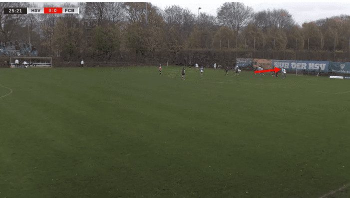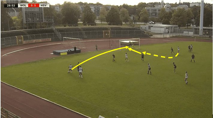 In this situation, they are playing against a dangerous Bayern II side, and as such, what instantly stands out is the difference in attacking shape, with Stoldt being the sole pivot option; the other thing to note is the lack of width in comparison to the previous example with Hamburger looking to keep things considerably tighter due to the attacking threat that Bayern possess.