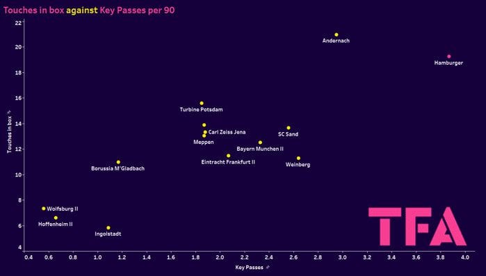 This graph illustrates that Hamburger are a leading side in both these aspects of the game. With an average number of key passes per 90 at 3.78, leading the division to the next best 0.92 key passes worse off. Then, in terms of touches in the box per 90, they are second in the division with 19.26, only bettered off by Andernach on 20.97.