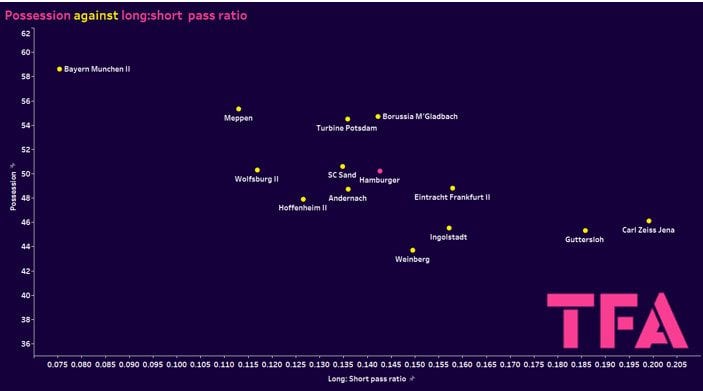However, as you can see, Hamburg is pretty middle of the row in both aspects, with them averaging 50.2% possession, which puts them in seventh place in the division. Then in terms of the long: short pass ratio, they completed 0.14 long passes for every pass they completed in the division, which puts them again in seventh place in the division, so around the middle of the pack.