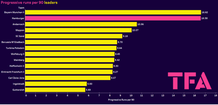 This table here illustrates that point nicely with Hamburger and Bayern II leading the way significantly over the rest of the division. When you break down that 16.58 progressive runs per 90, the prominent names that crop up are left winger Lisa Baum, 3.15 progressive runs per 90, right winger Melina Krüger, 2.38 progressive runs per 90, centre forward Carla Schulz, 2.38 progressive runs per 90. As you can see, these three players make a significant bulk of the progressive runs per 90, and actually, all three players are in the top twelve performers in the division.