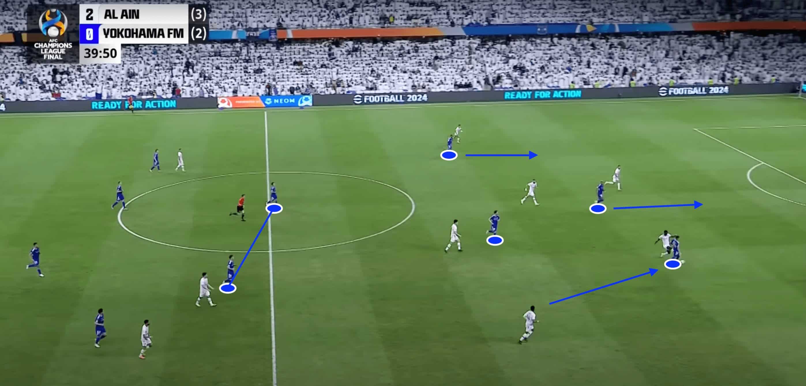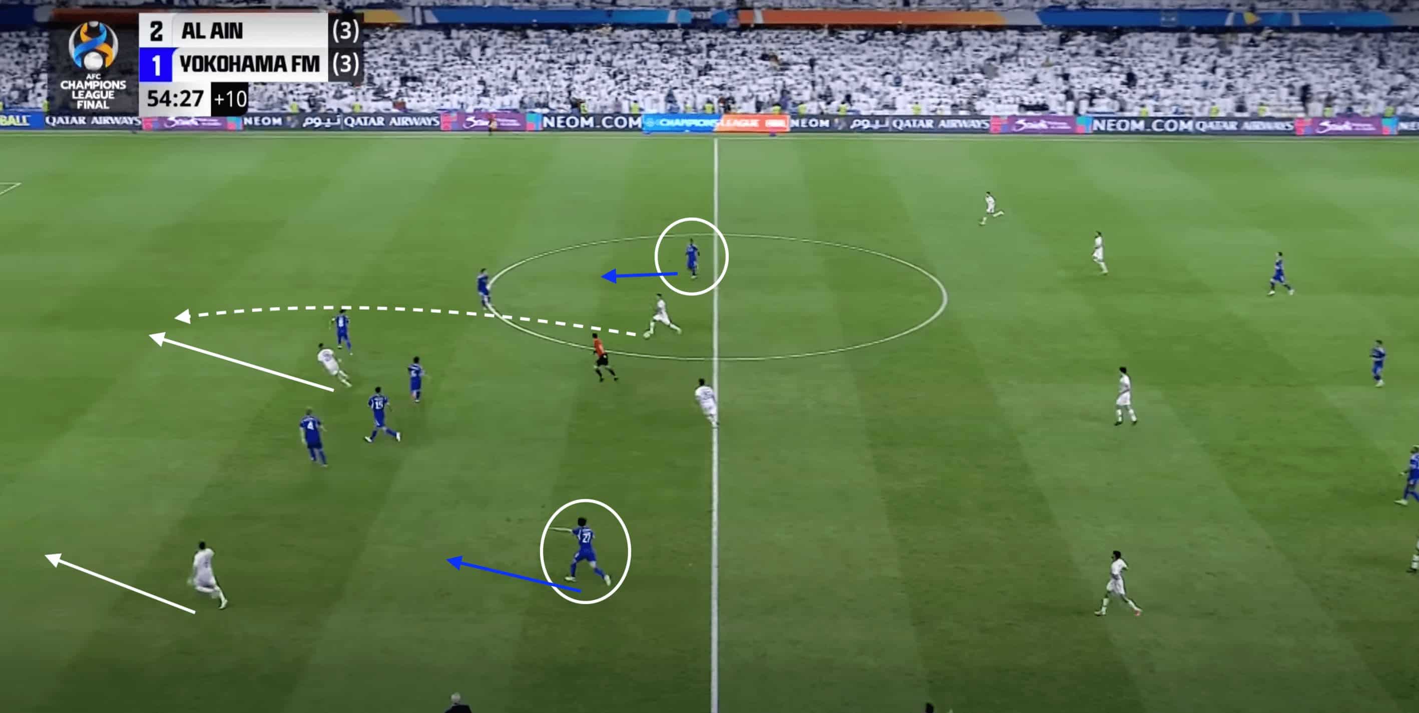In their biggest match of the season, facing Al Ain in the second leg of the final, it was their ability to capitalise on moments of error that allowed the Marinos to inject life into their attacking efforts, with the example below depicting Yan Matheus’ high press from their 4-2-3-1 defensive shape, dispossessing Kouame Autonne after a heavy touch.