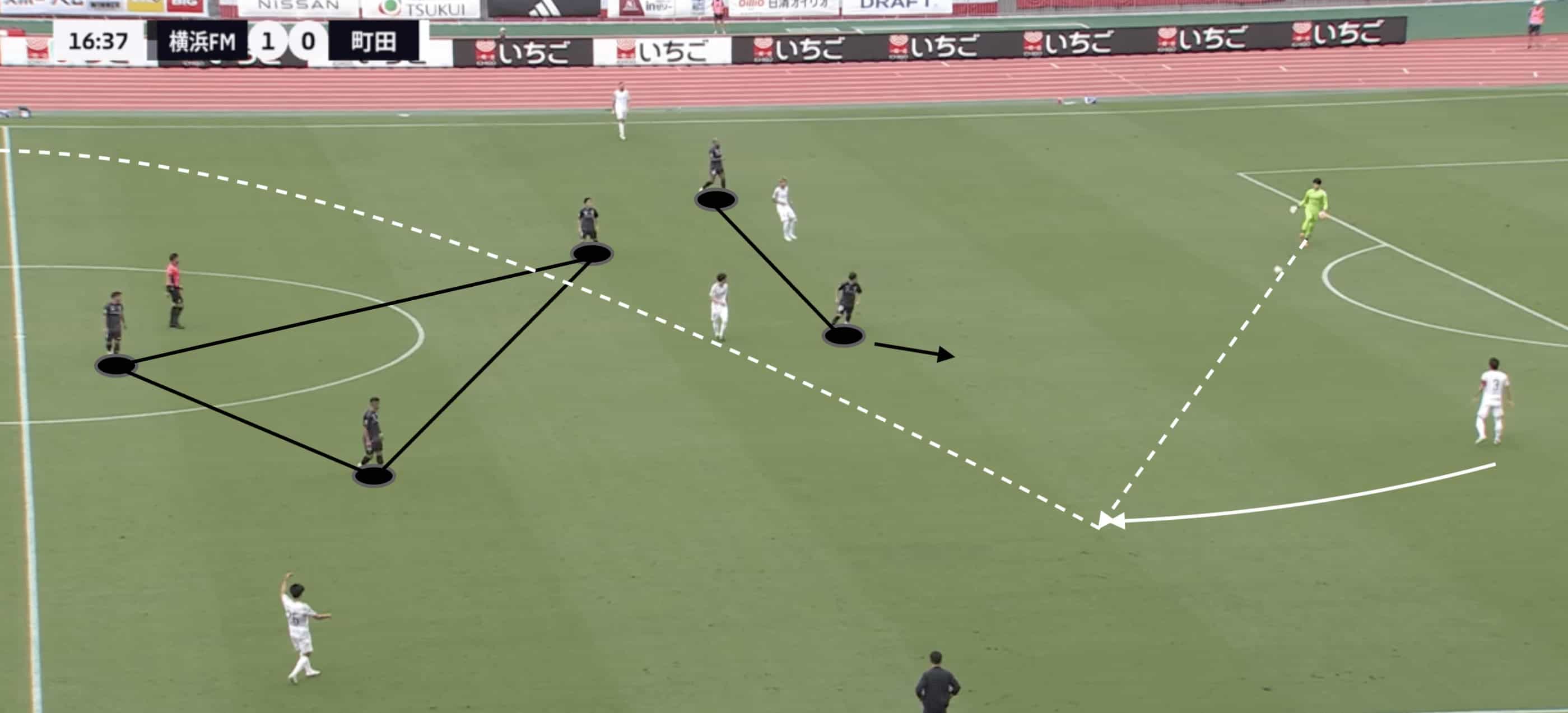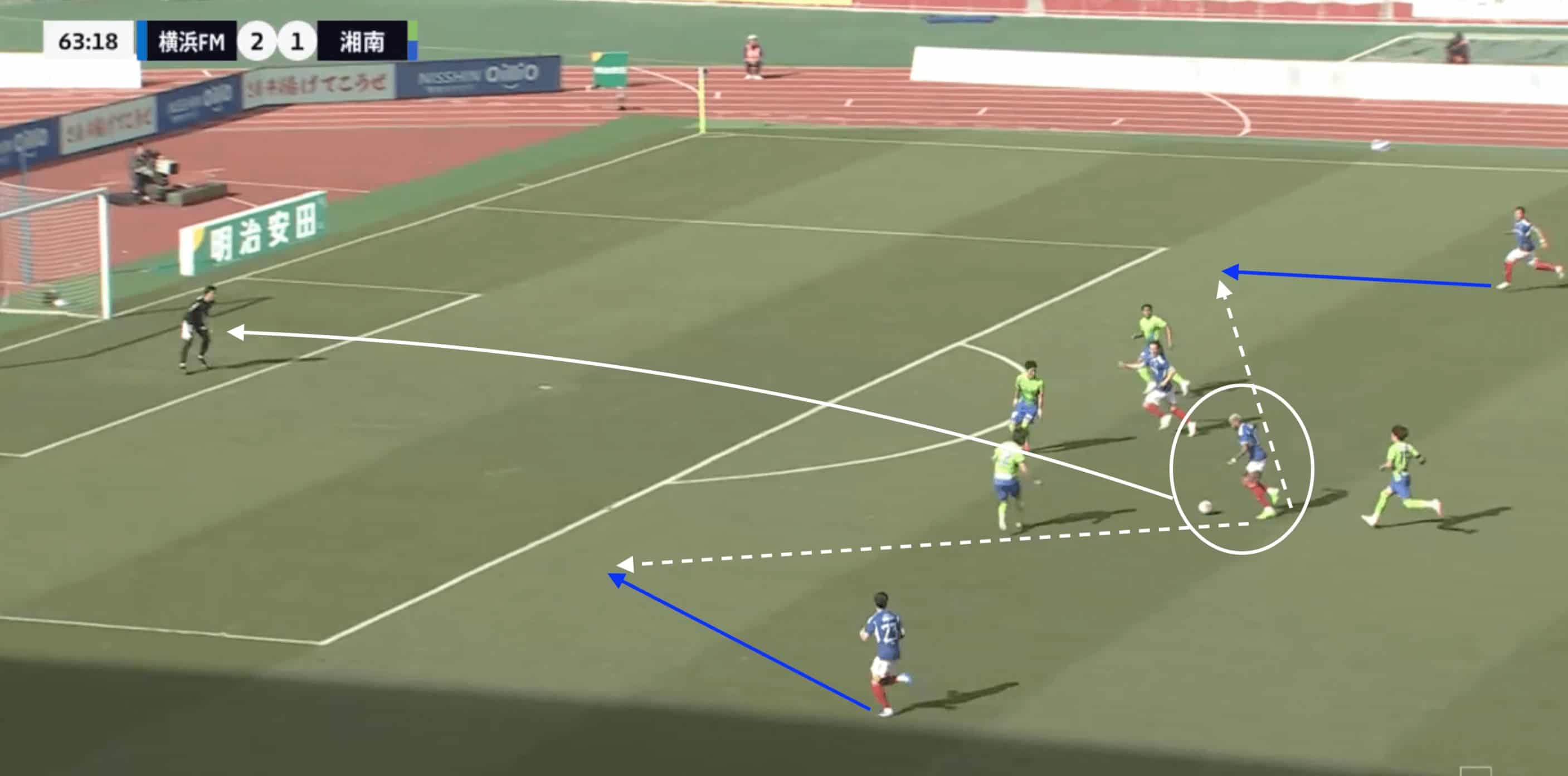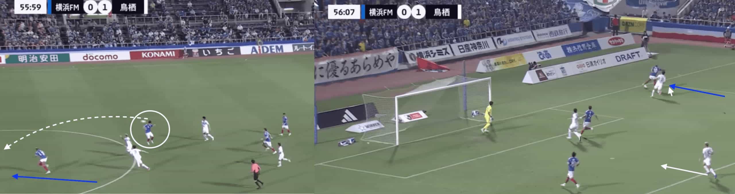 With Amano failing to get across and challenge the ball carrier, Gen Shoji was able to launch a devastating diagonal ball across to the right flank, providing Machida Zelvia with an excellent opportunity to run at the Marinos defensive line.