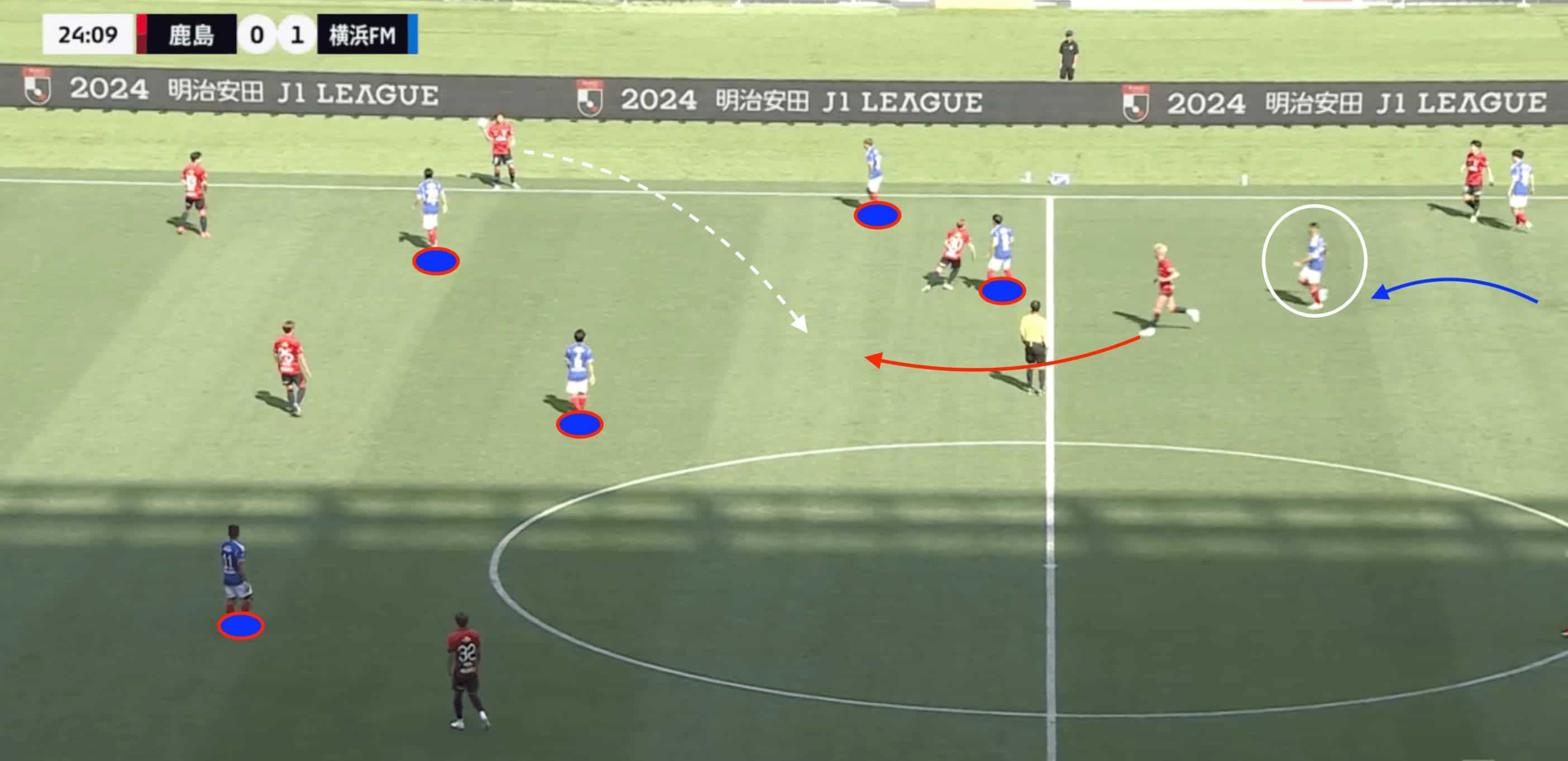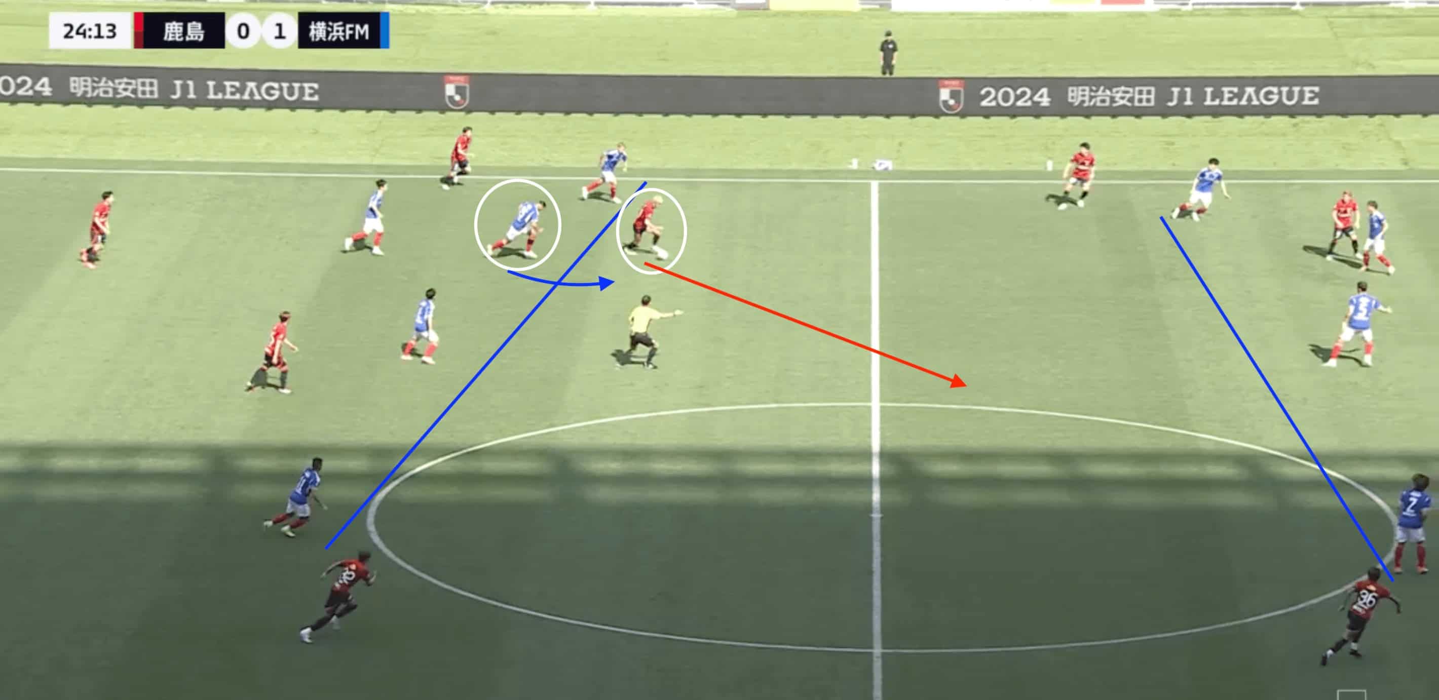 Unfortunately for Kewell, in an attempt to perhaps overcompensate for their weaker press, we see the Marinos becoming overly eager in their pressing efforts, creating moments of vulnerability in transition.