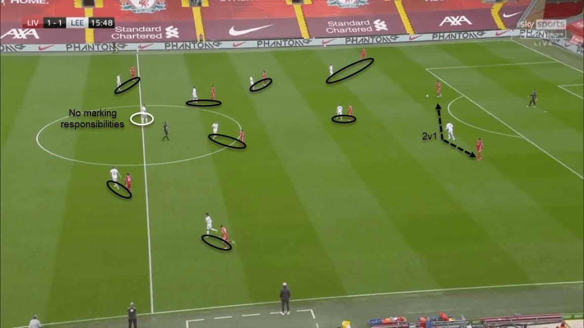 Nothing much changes about the defensive ideas when it comes to set-pieces. Leeds followed the same man-to-man marking strategy in this phase of the game. It works wonders in throw-ins for them as they don’t shift responsibilities but just track their players. The third equaliser against Liverpool was from winning the possession from Liverpool’s throw-in. Now that’s quite impressive against a team that has hired a specialised throw-in coach.