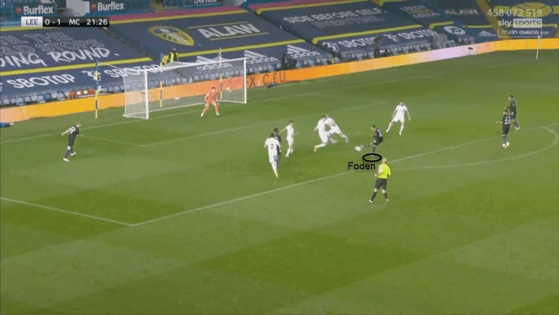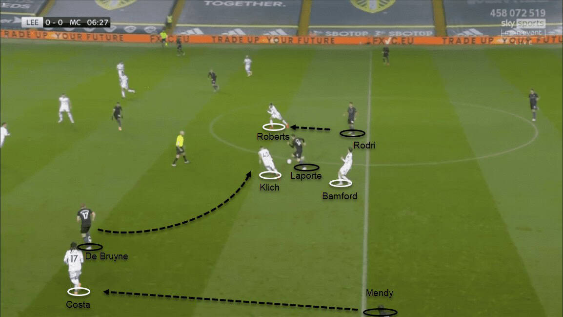 To explain it with an example, look at the scenario against Manchester City. Laporte got ahead of Bamford who couldn’t stop his run. Roberts left his man Rodri to close down Laporte from his right. Costa’s support in the right time enabled Klich to peel off De Bruyne and press Laporte. Both Klich and Roberts closed the channel and forced a back pass.