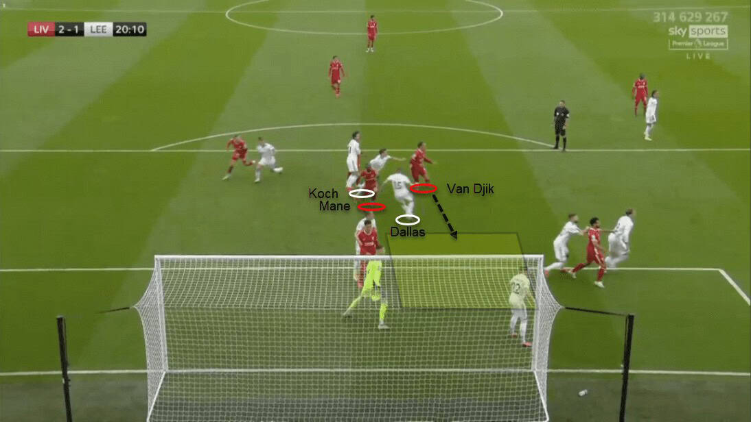 However, the same strategy has opposite effects in corners. In the same match against Liverpool, Leeds United adopted a complete man-marking system in corners. Liverpool players used the ‘Train’ tactic to the line-up, due to which Koch couldn’t mark van Dijk from the start. As the corner was taken, Salah moved ahead of front post vacating that area for van Dijk to arrive. Mane moved backward to impede Koch’s movement to get to van Dijk. van Dijk won a free header and he thumped it in at home for taking the lead. Leeds had no zonal players to guard the six-yard box. Given their 45.4 win % in aerial duels, is complete man-marking the best option for set-pieces?