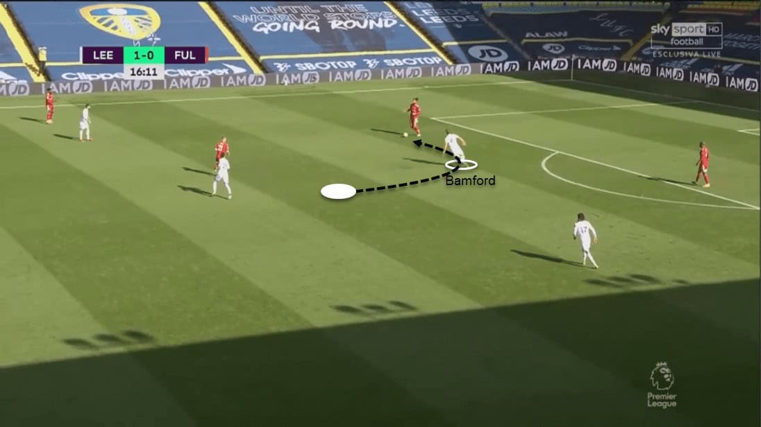Bamford’s role is crucial in dictating the direction of play from opposition’s build-up. Since he is up against two centre-backs, he deals with this numerical disadvantage with his smart pressing angles. His movement to press is outward to inward, this helps in eliminating the lateral option (other centre-back) and the goalkeeper. This encourages the centre-back on the ball to play wide and forward where all the players are marked tightly. Bamford’s movement is key in making the play predictable and nullifying the numerical advantage.