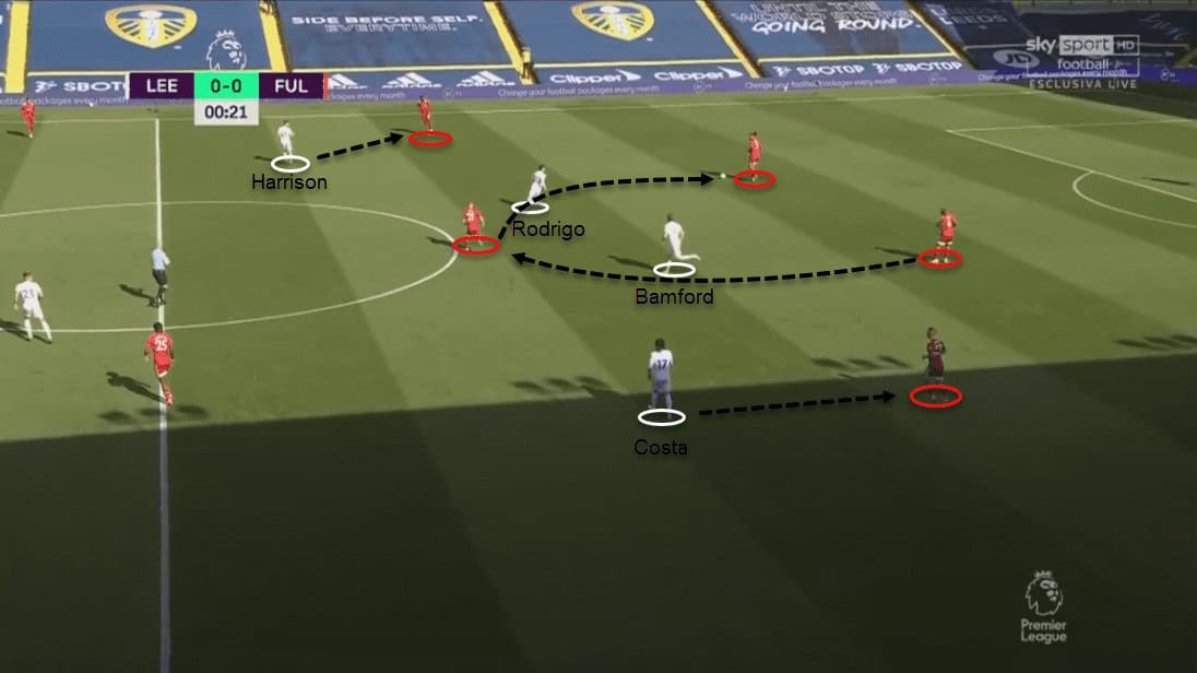 He also combines with the pseudo no.10 (CM marking opposition pivot) to execute the upper pendulum pressing. That is, Bamford and Roberts/Rodrigo shift duties to mark the opposition pivot tightly when the centre-backs pass to each other and press them accordingly. The wingers mark the full-backs and only join the press when the opposition goalkeeper is involved. In such case, Costa/Harrison stations themselves between the opposition centre-back and full-back to support the forward in press. This system in the offensive half makes it very difficult for the opposition to progress the ball. It forces them to go long as there is a lack of free options.