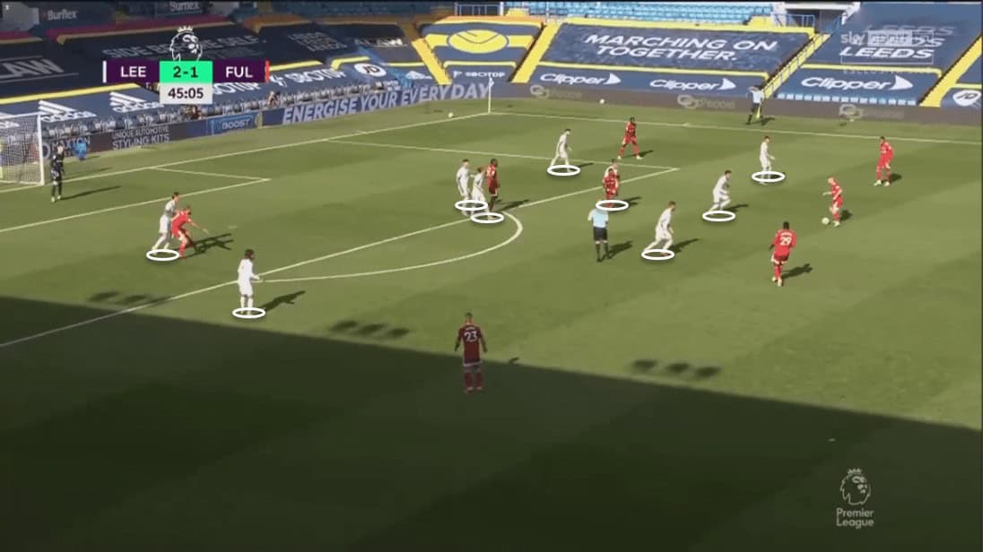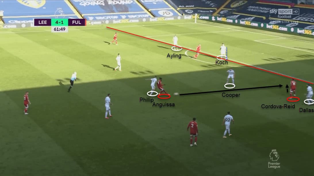 When Leeds played Fulham, Zambo-Anguissa managed to skip past Phillips after they won the ball from Leeds’ build-up. Despite the Leeds’ defenders getting back close to their marking players, their shape was unorganised and there was a lot of distance between them. Cooper who was relieved from marking on that occasion was too distant to close Zambo-Anguissa. Koch and Ayling held the line back as they were marking their respective players. Therefore, Decordova-Reid had enough space to run in behind without worrying about being offside. He scored the second goal for Fulham and brought them back in the game.