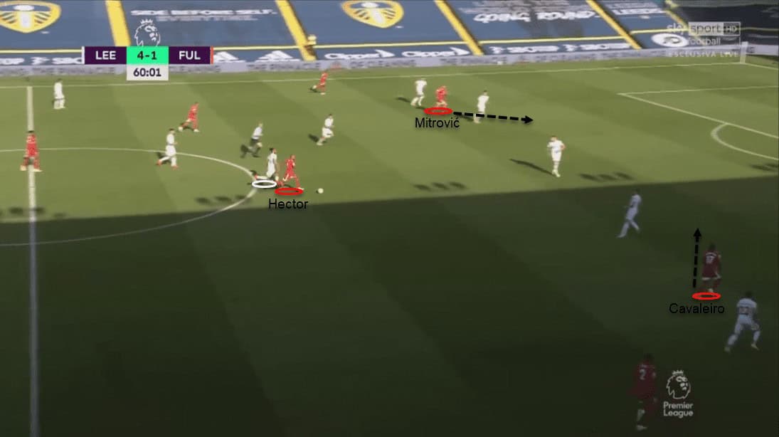 The wingers take this opportunity and try to cut inside. The full-backs are caught flatfooted like against Manchester City. Sterling dribbled across the defence line horizontally from the left and curled one past Meslier. Otherwise, if they track the run, they leave space for full-backs to overlap. Against Fulham, Costa had committed himself ahead to help Bamford press the goalkeeper. On receiving the ball, Cavaleiro cut inside and pulled Ayling with him. This left Bryan completely unmarked when he made an overlapping run on the left-wing. Cavaleiro passed to him and then Koch brought him down in the box to give away a silly penalty.