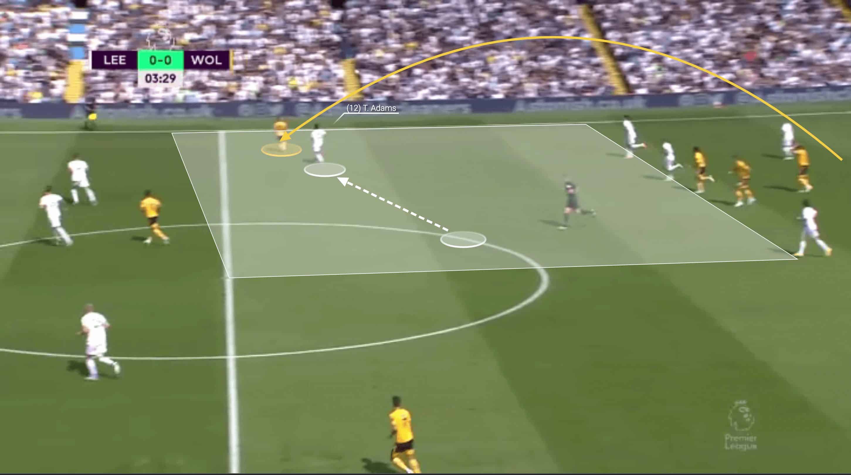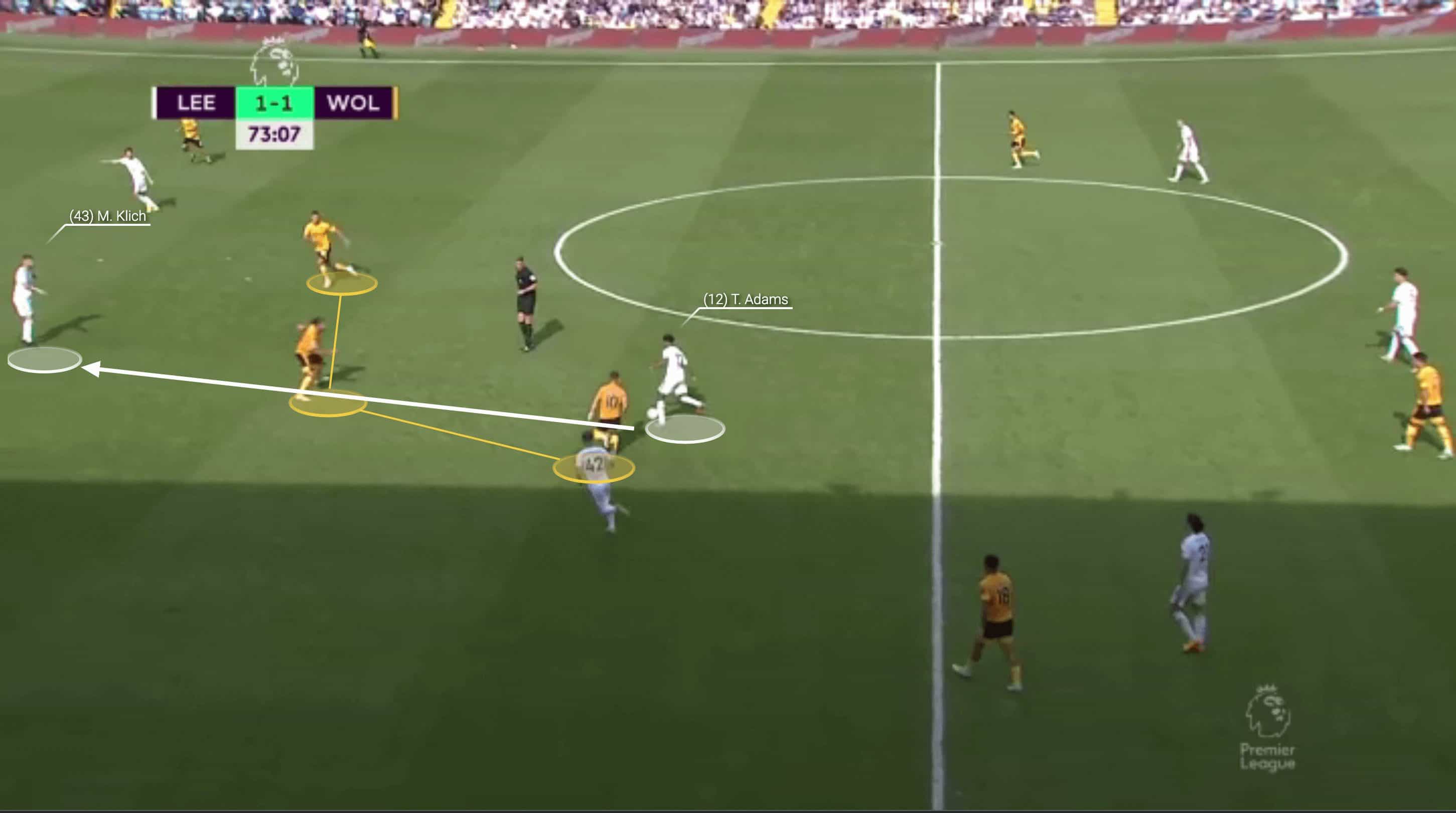 We see an example of that above in the build-up to the second Leeds goal as Adams is on the ball in the midfield. He passses aggressively to release Mateusz Klich into space and breaks the line of Wolves’ pressure in front of him while doing so.