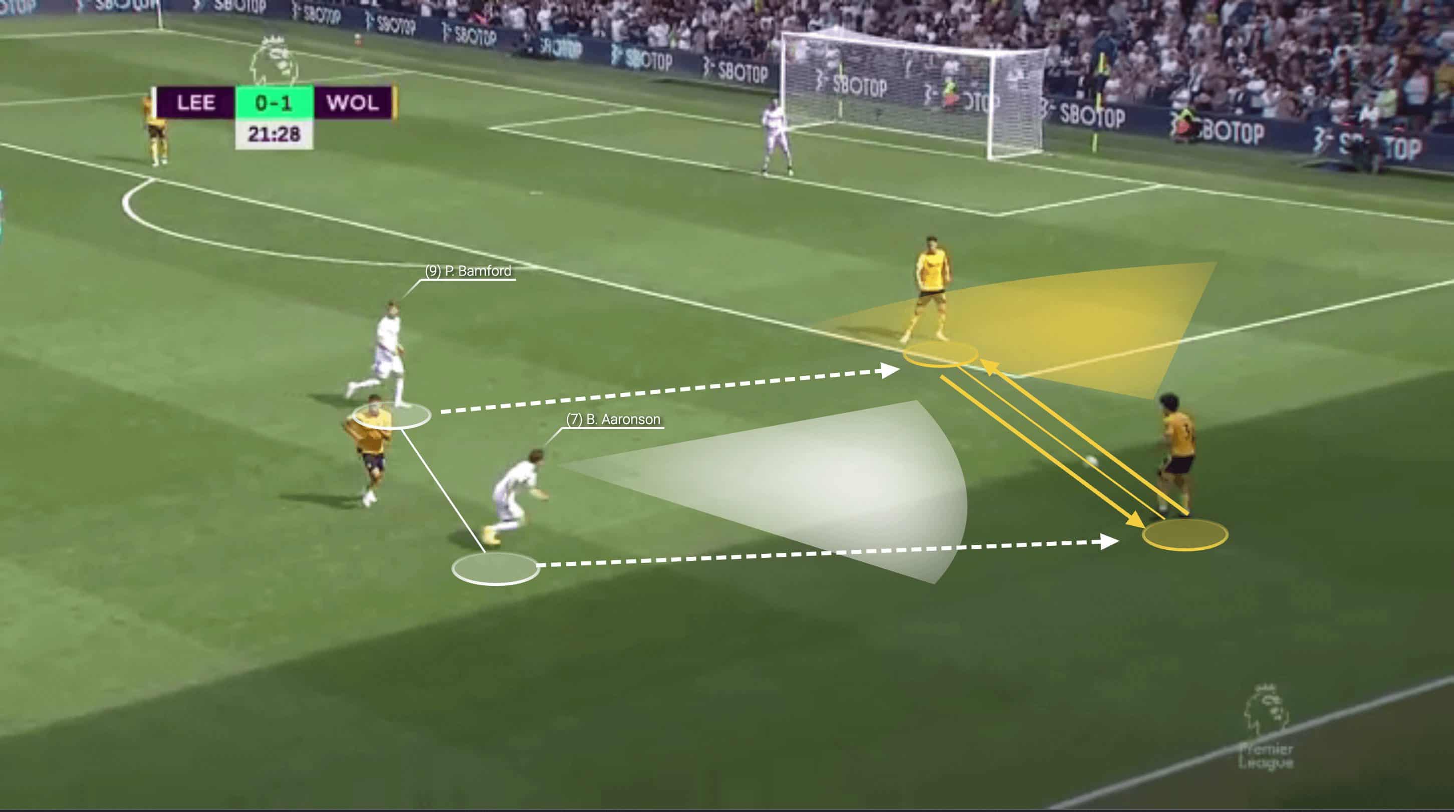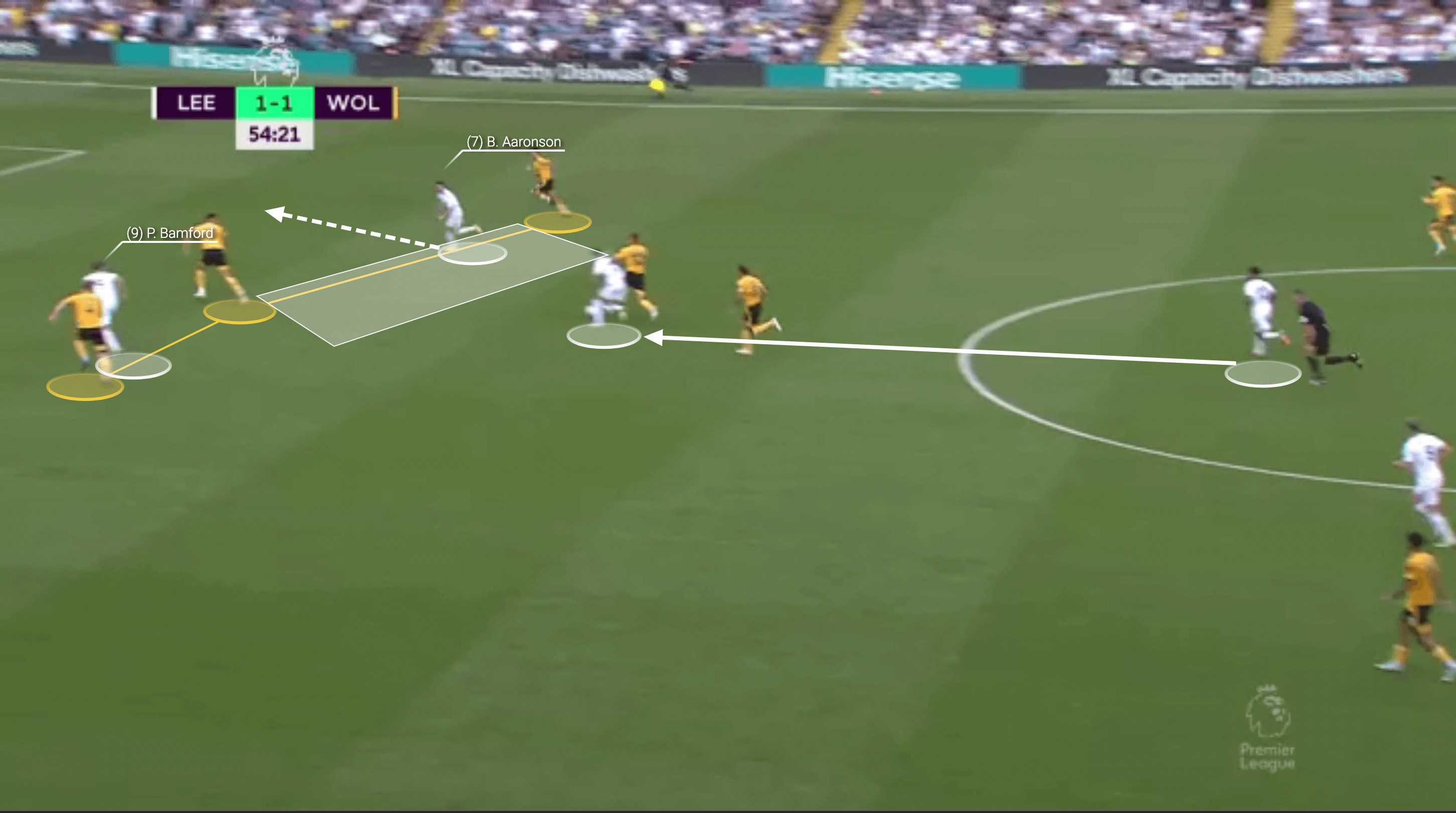 In the early stages of the game, Aaronson’s movement was creating danger for Wolves although teammates were struggling to access these runs.