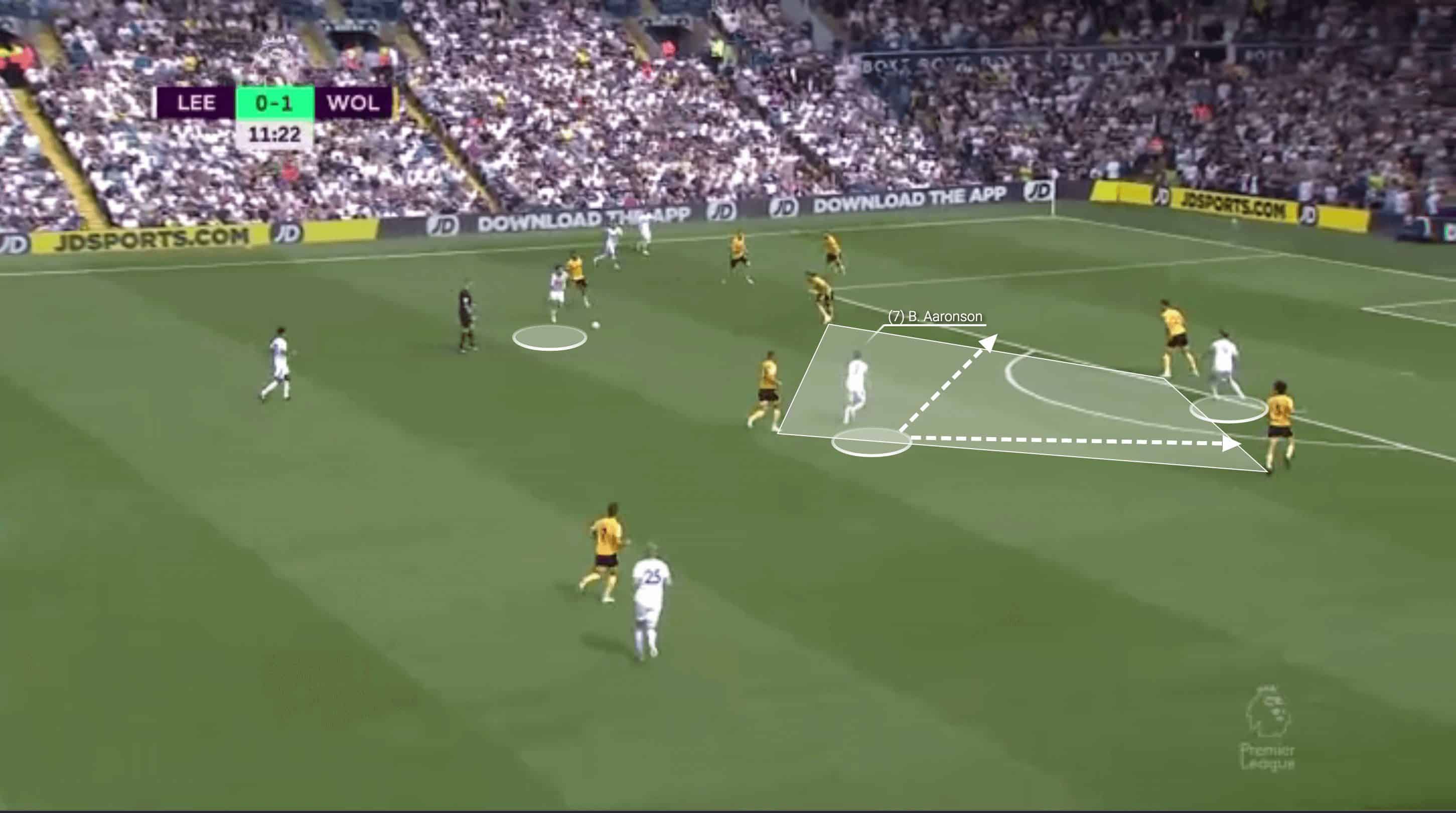 In the early stages of the game, Aaronsons movement was creating danger for Wolves although teammates were struggling to access these runs.
