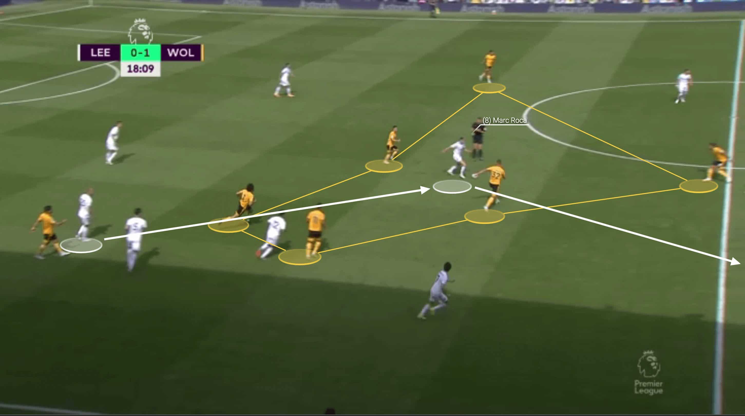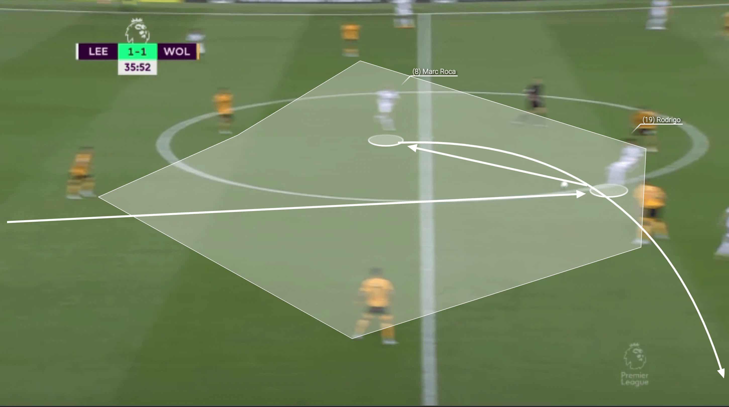 Roca is technically very good on the ball and his ability to weight a pass on minimal touches was important for Leeds as they looked to maintain the high pace of their attacking build-up play. In this example, Roca is the key to an ‘up, back and through’ passing combination, something that Leeds fans will see a lot of under Marsch, as the first pass goes to an advanced player before getting set back to a midfielder, Roca in this instance, before being played again quickly.