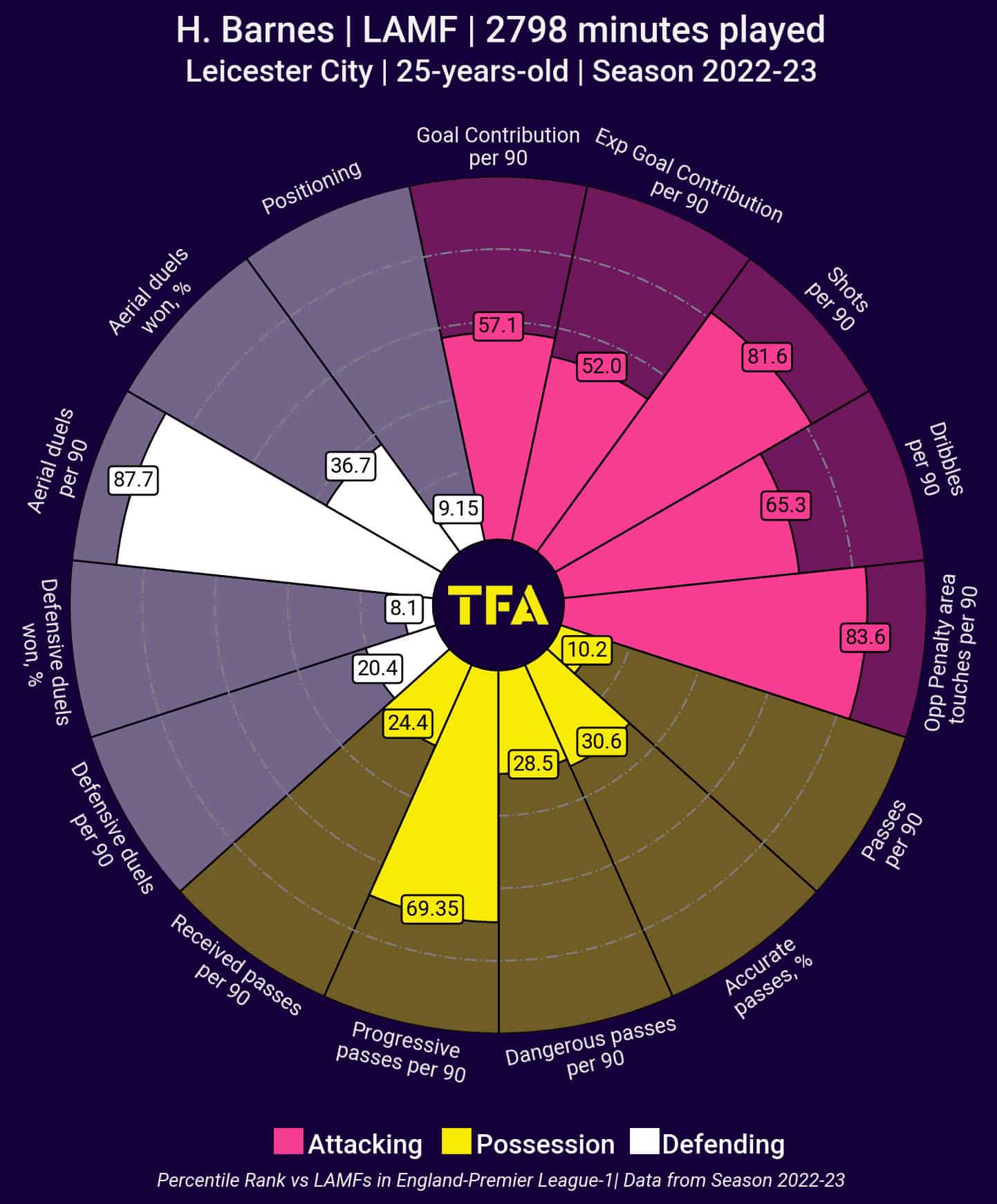 He may lack some creativity in the final third, especially in his passing, but he would work well in teams that leave space behind for him to exploit. However, with Barnes contracted to Leicester until 2025, the Foxes may hold out for more money than some clubs may be willing to spend.