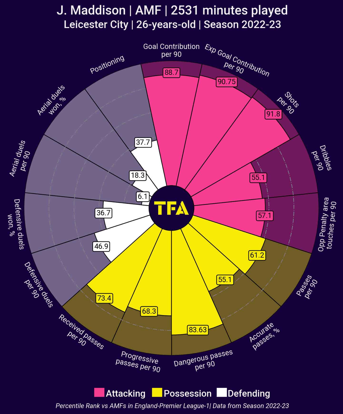 Maddison has a year left on his contract. With 10 goals and 9 assists in the Premier League this season, he is enjoying one of his best seasons with Leicester. Maddison is able to operate in midfield or out wide on the right and has an incredible ability to pick out a pass or have a shot himself, noting his dangerous passes per 90 and high shots per 90.