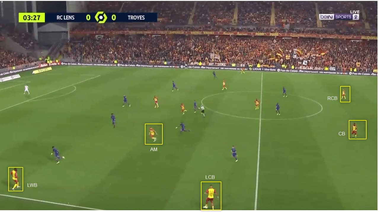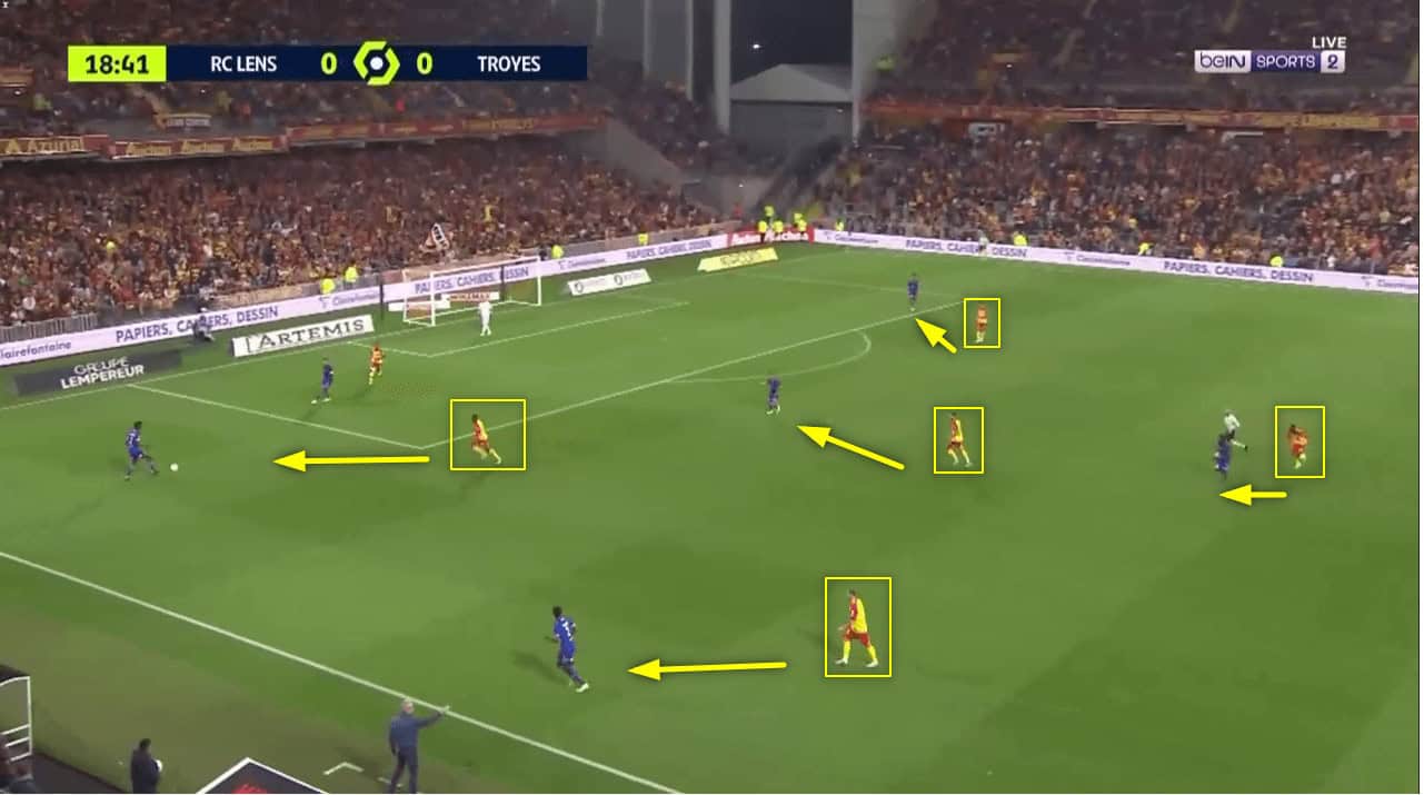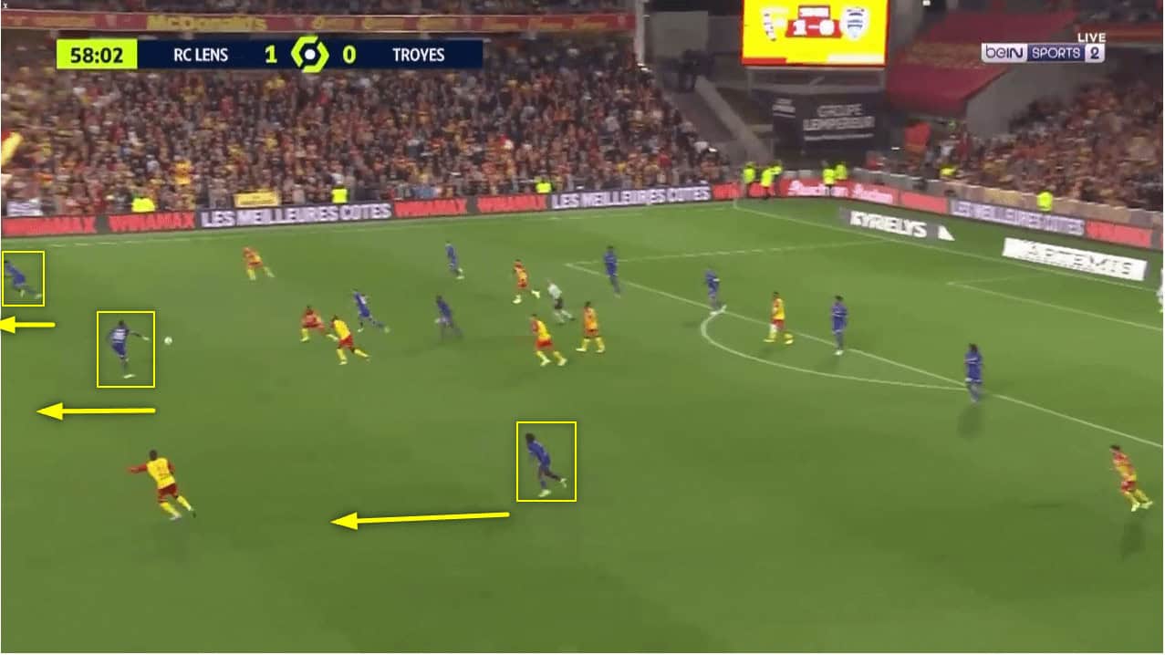 The reason behind this is so Lens’ wingbacks Haïdara and Cabot can pin Troyes’s wingbacks, stopping them from pushing high up the pitch and pressing Lens as they build up.