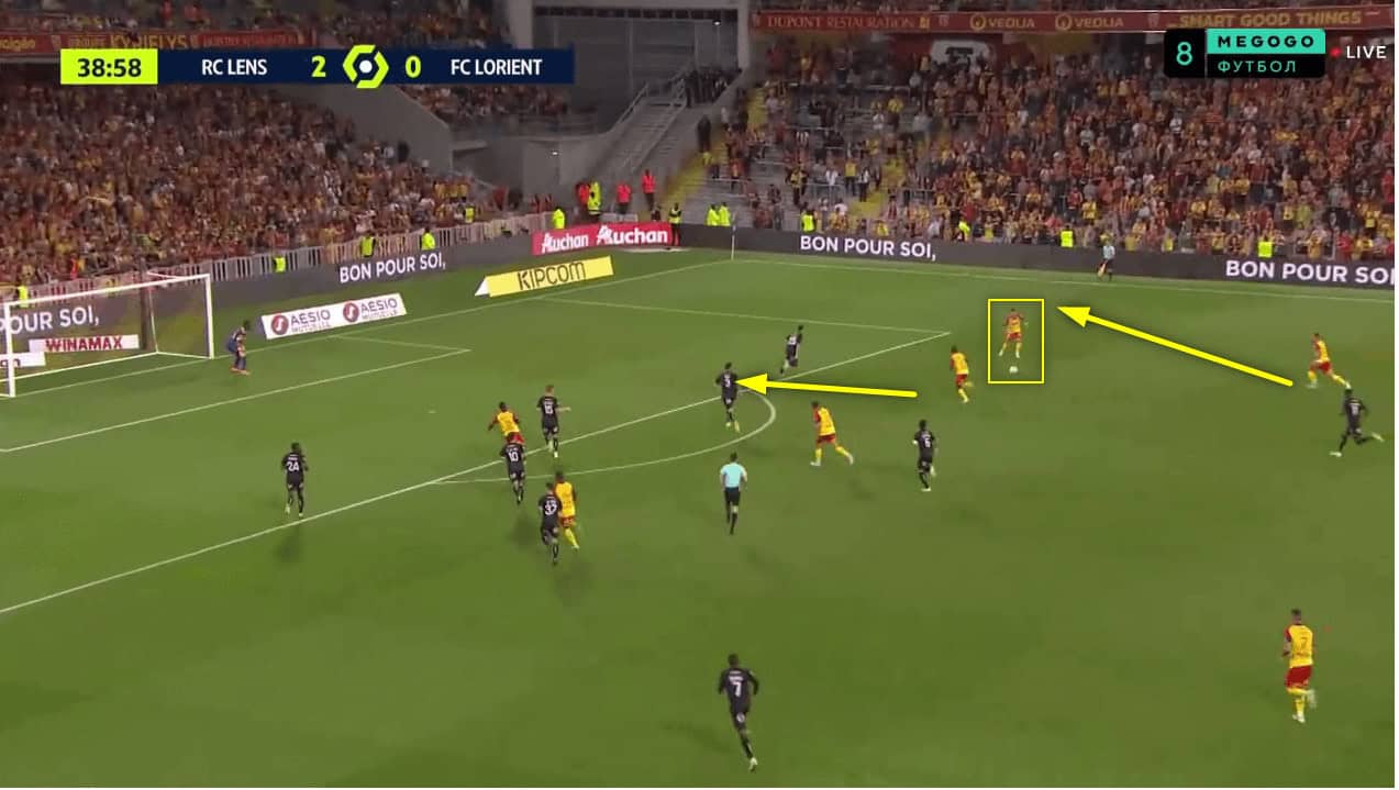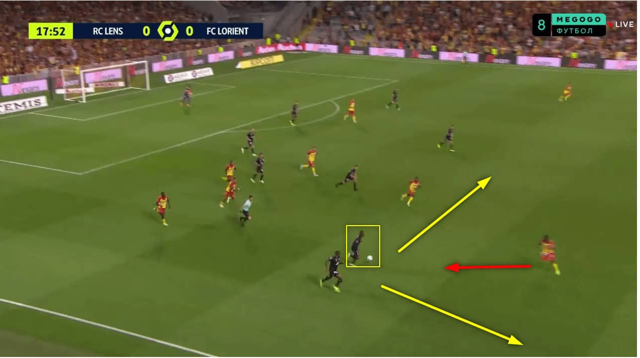 In this one, you can see how Lens have created are about a top create 2v1 overload down the right and how they have two players running in behind on either side of FC Lorient’s left wing-back.