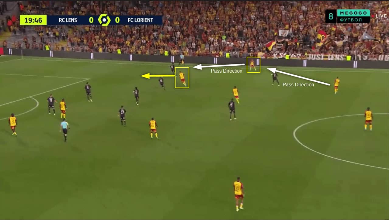 Here, you can in these images how Lens start each attack out wide and immediately look for the through ball in behind FC Lorient’s defence.