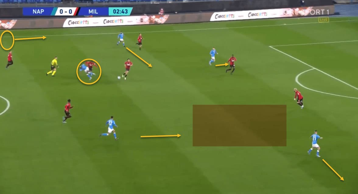 Victor Osimhen is the focal point for this passage of play. It is him dropping deep than prompts the positional interchange around him. As Osimhen drops deep to receive a direct ball, Piotr Zielinski makes a vertical run beyond him and Milan’s defensive line. Mario Rui (off-screen) attacks the space vacated by Lorenzo Insigne down the left-hand channel. Insigne then moves into half-space.