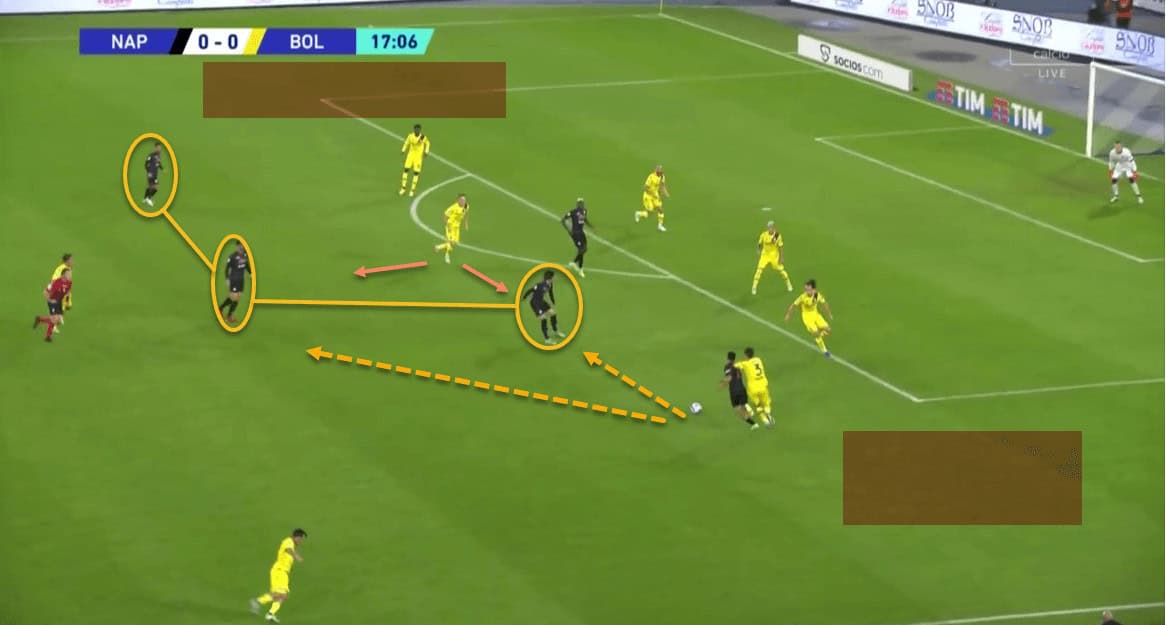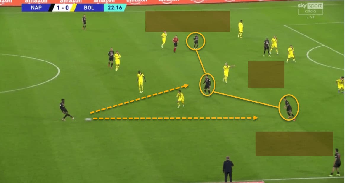 Napoli has multiple options in front of Bologna’s defence. The advantage of putting more than one player in between the lines is that it causes your opponents to sit narrower. Like Bologna has done in both examples. This allowed Napoli to dominate the wide areas.