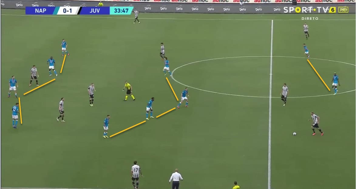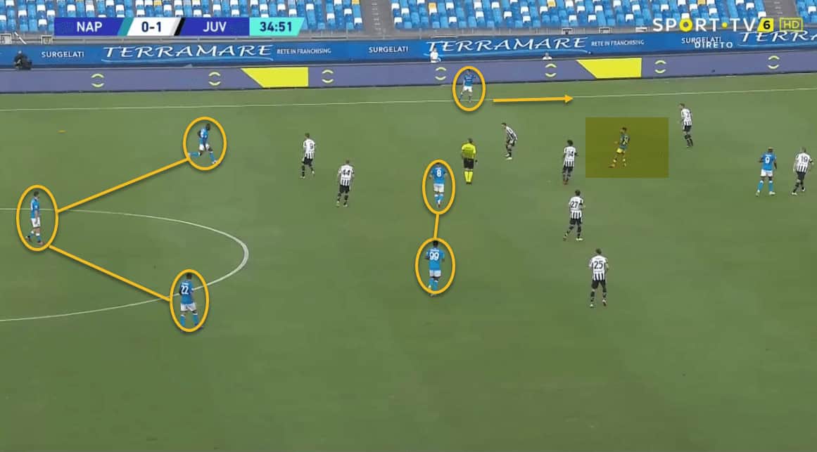 A Napoli player will be looking to attack or occupy every zone across the pitch in this passage of play.