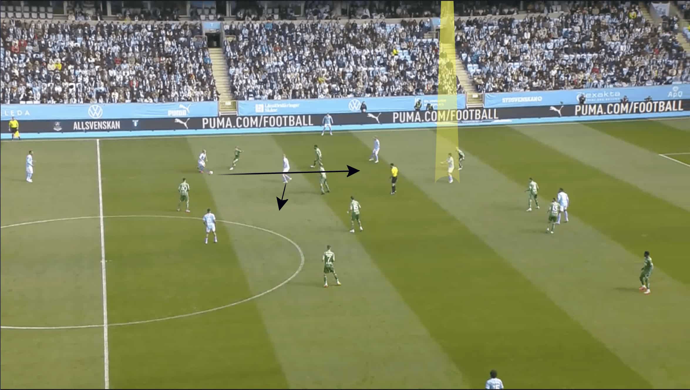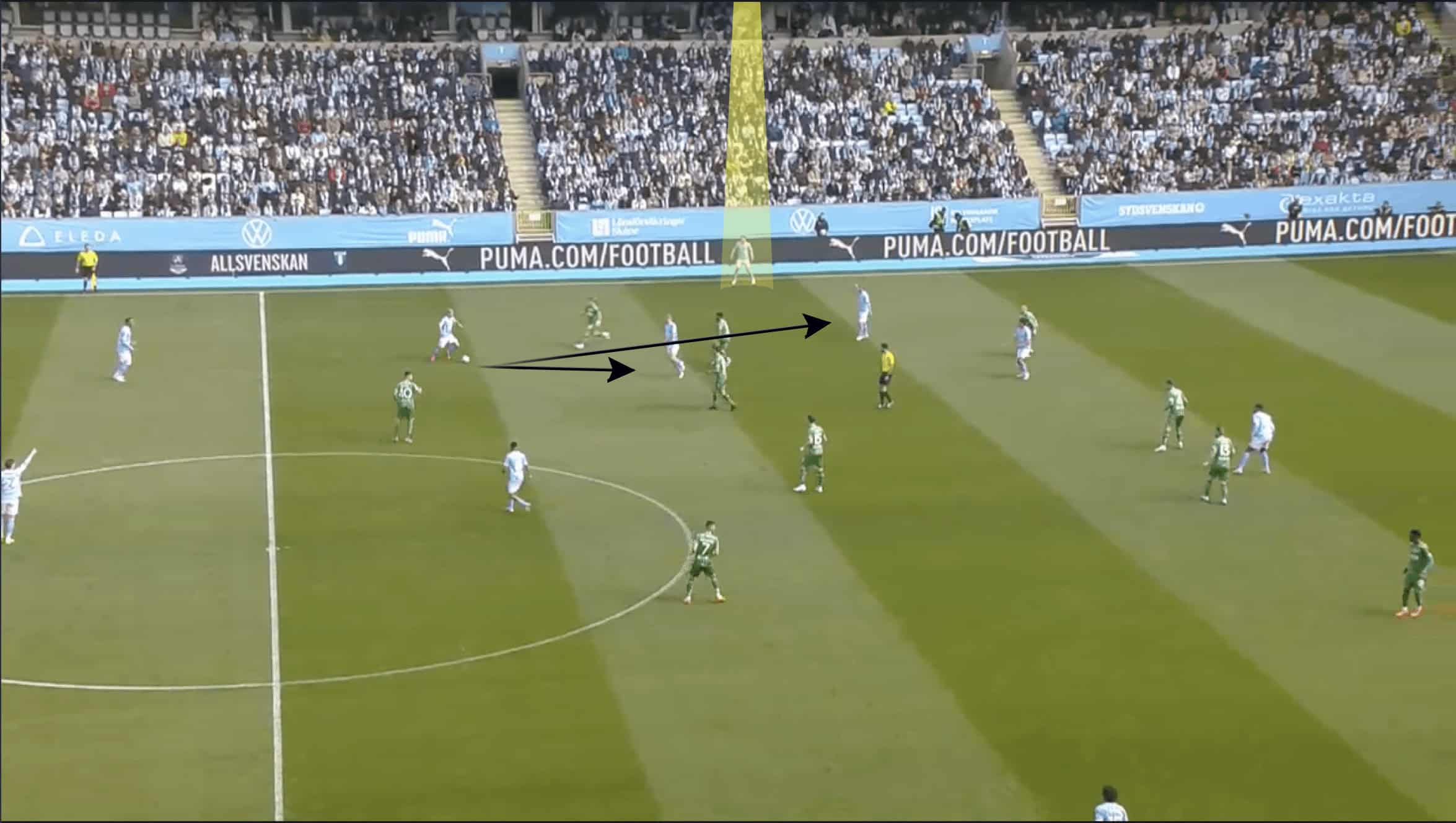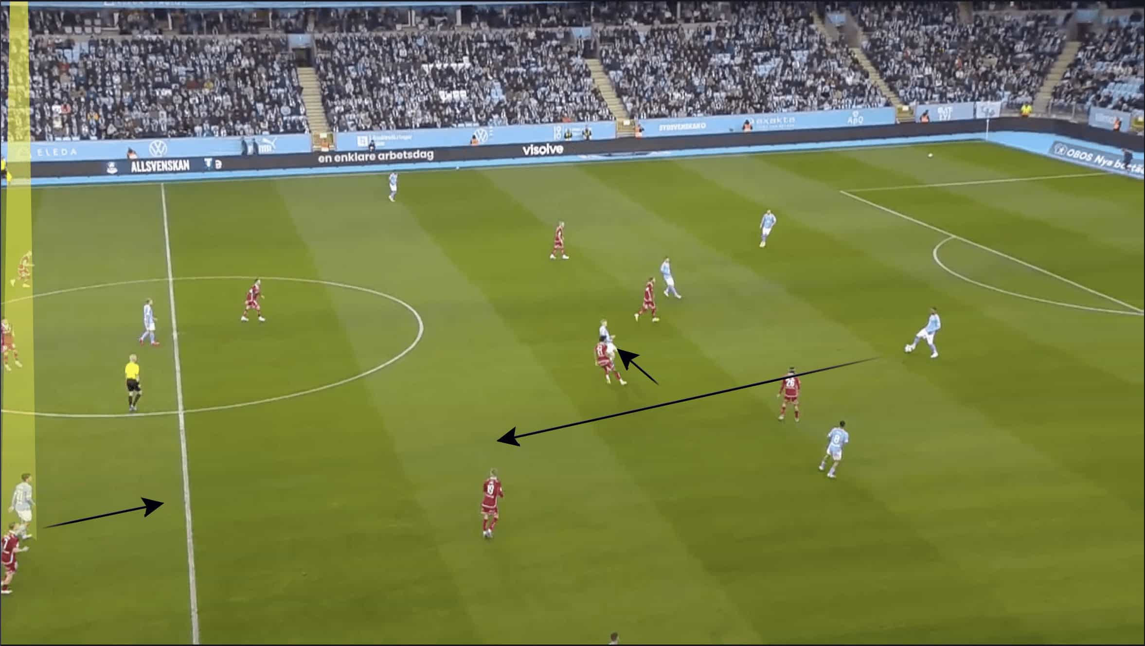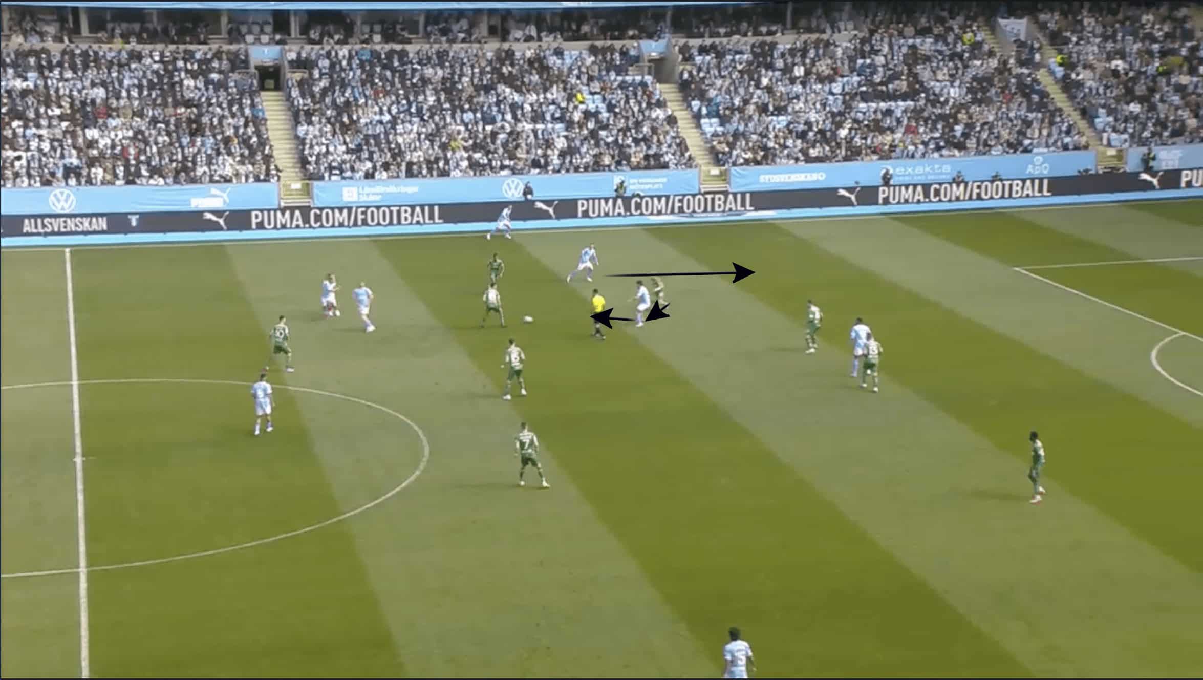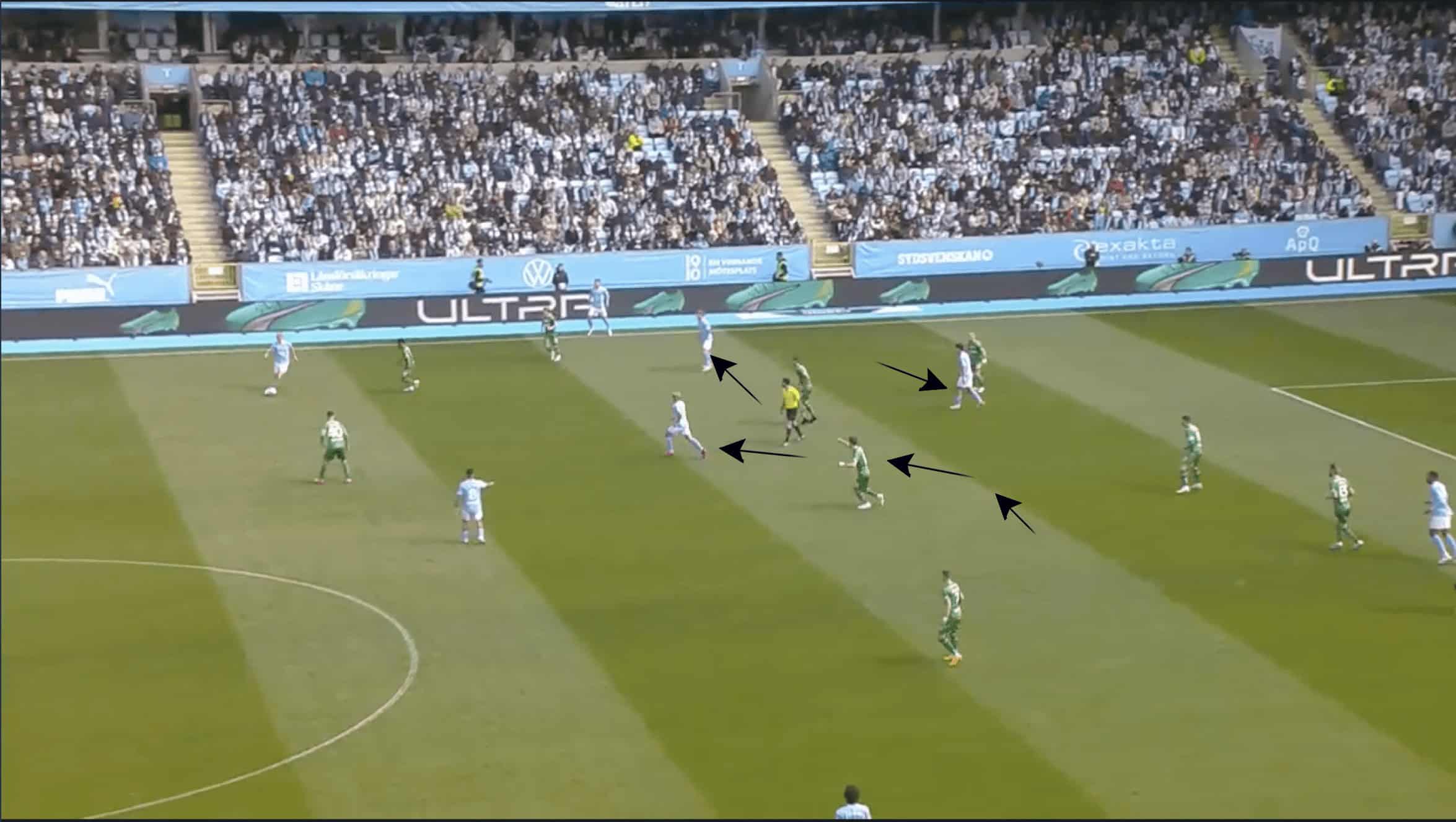 The first, which can be seen in the image above, is numerical superiority in the wide area, with Malmö players outnumbering Hammarby by five to four.