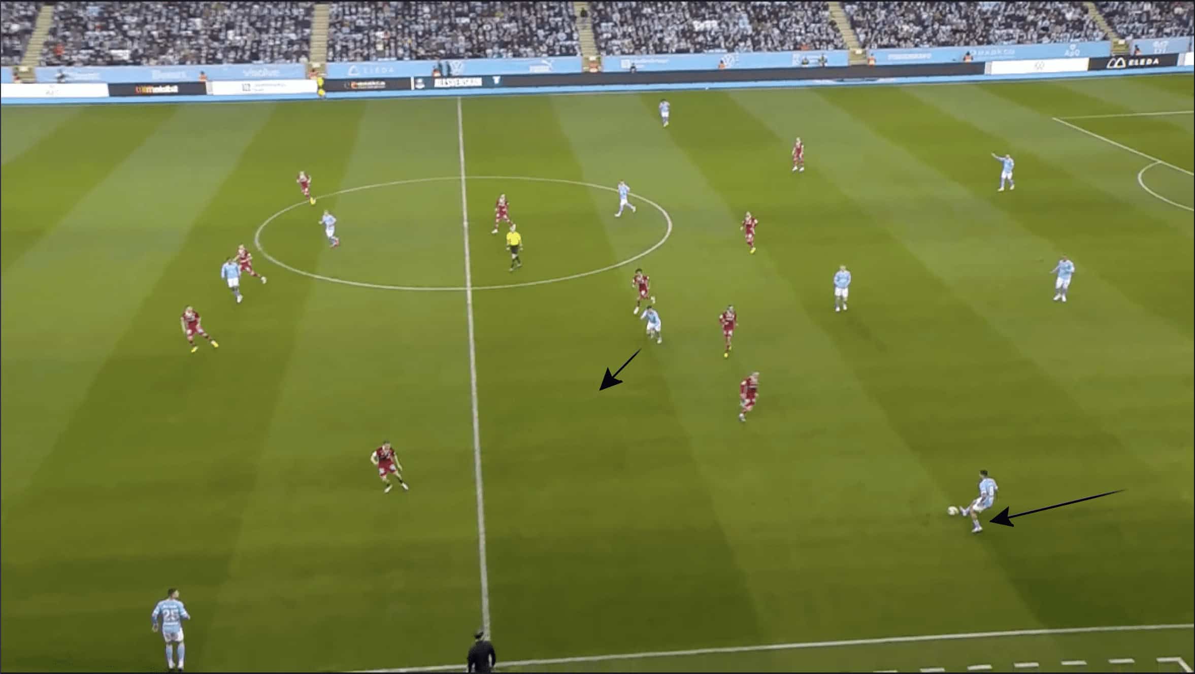 Having been on the left-hand side, Larsson indents his position to offer a vertical passing option, with Christiansen and Vecchia in similar positions to the previous example, looking to do the same.