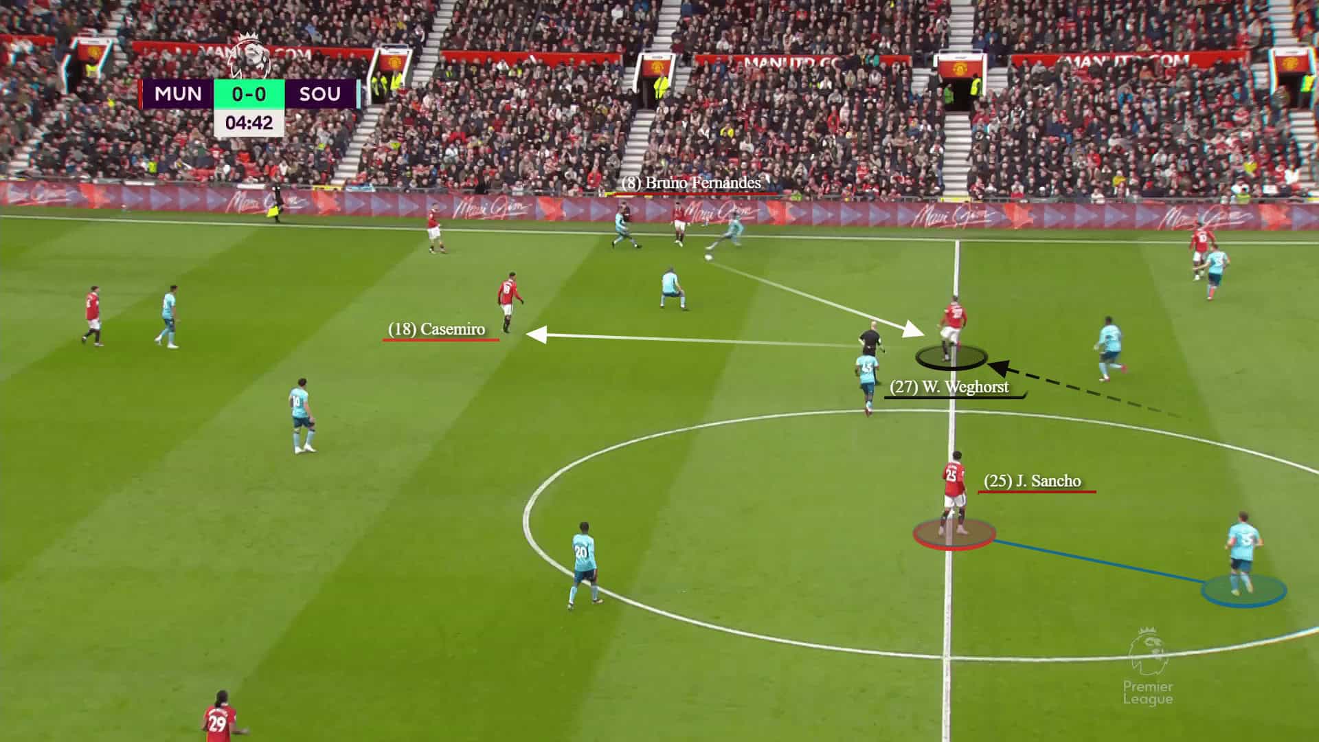 In contrast, defensively, Bruno and Sancho above Casemiro can have a significant defensive impact as it forces Casemiro to cover more ground and both centre-backs to be more proactive in confronting opponents coming into the half-spaces.