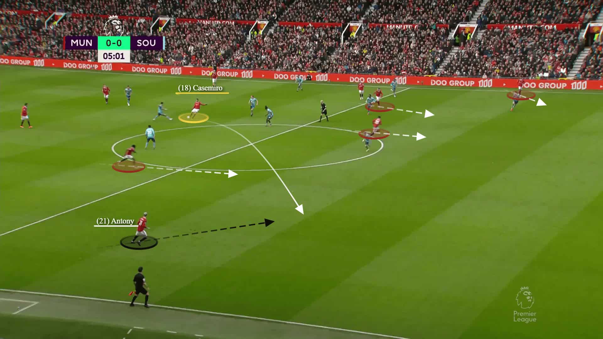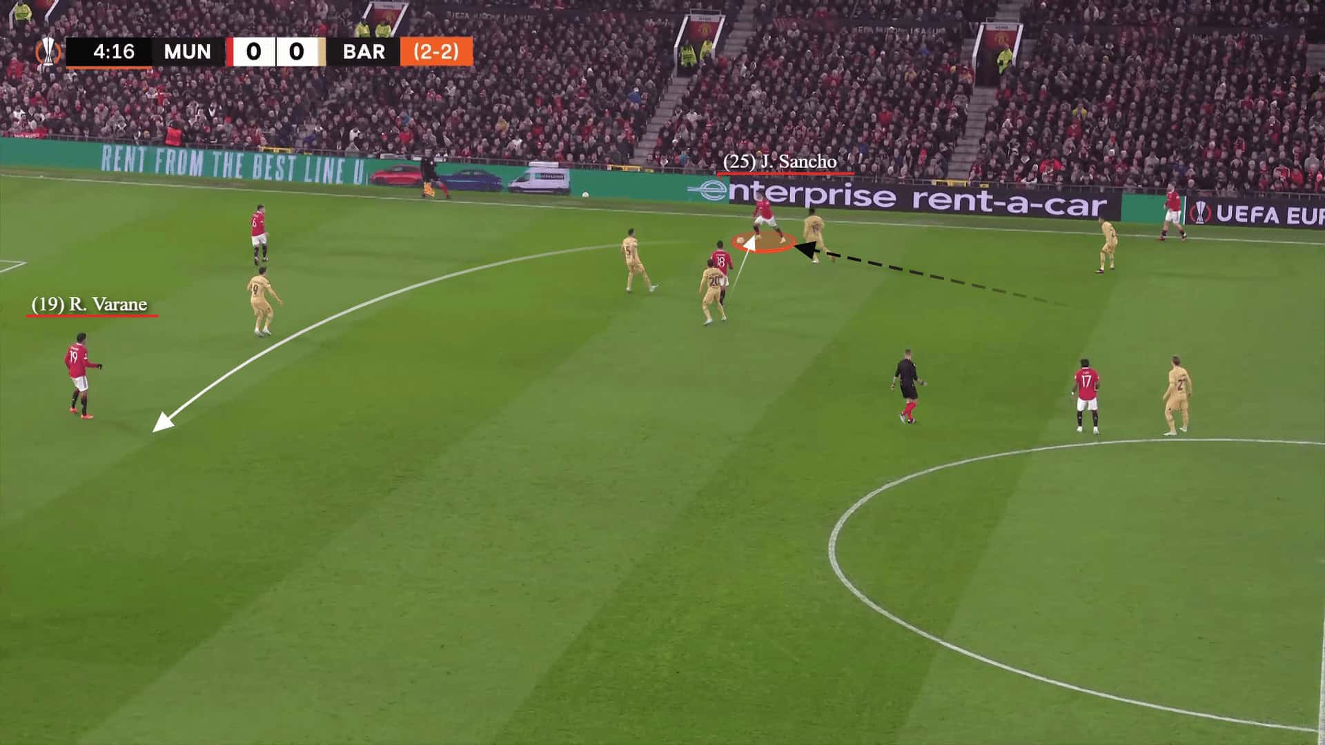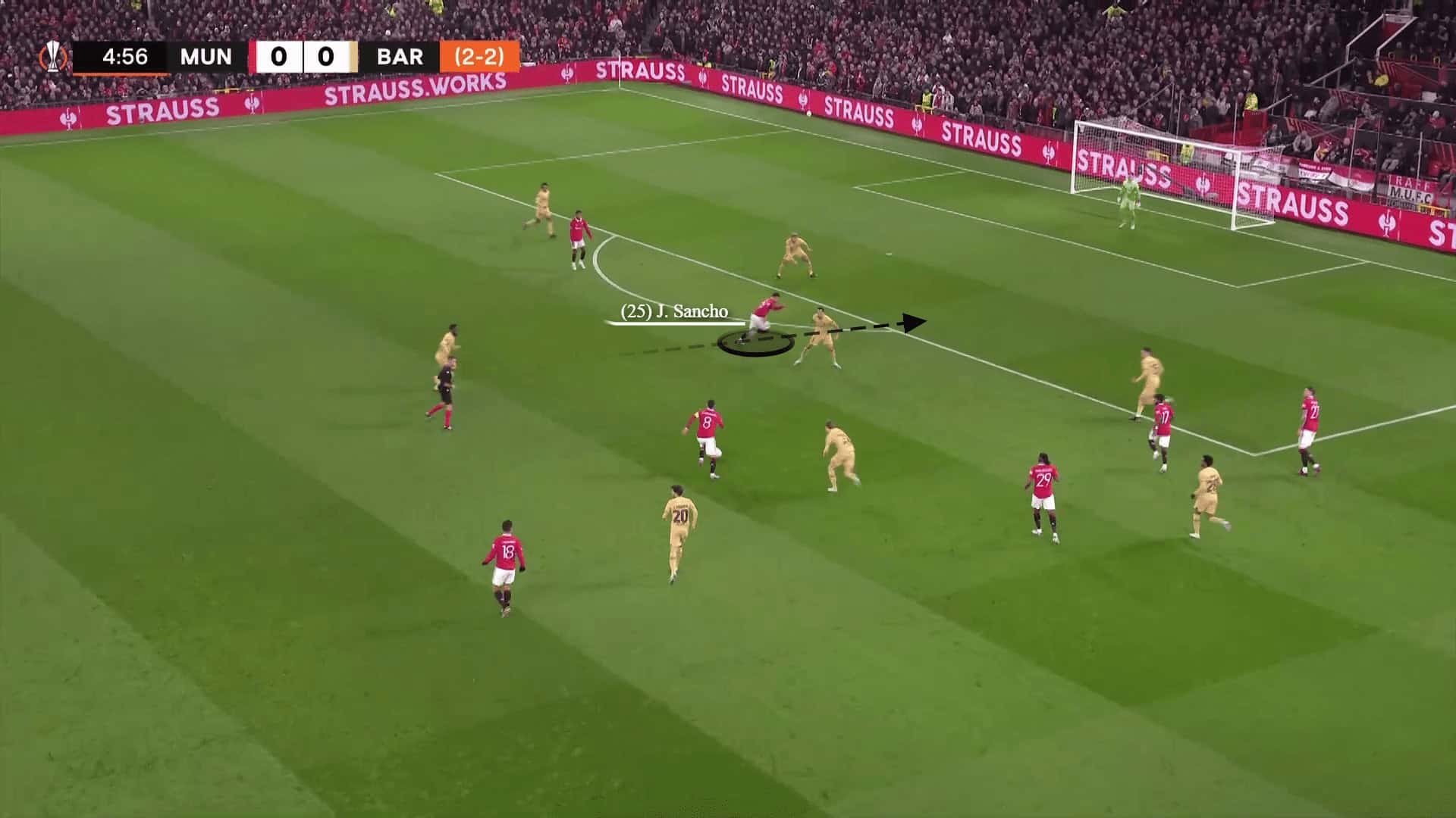 Once Casemiro received the wall pass, he switched the play to the weak side to Antony, while Sancho and the rest attacked the backline.