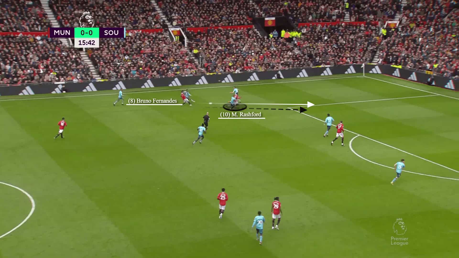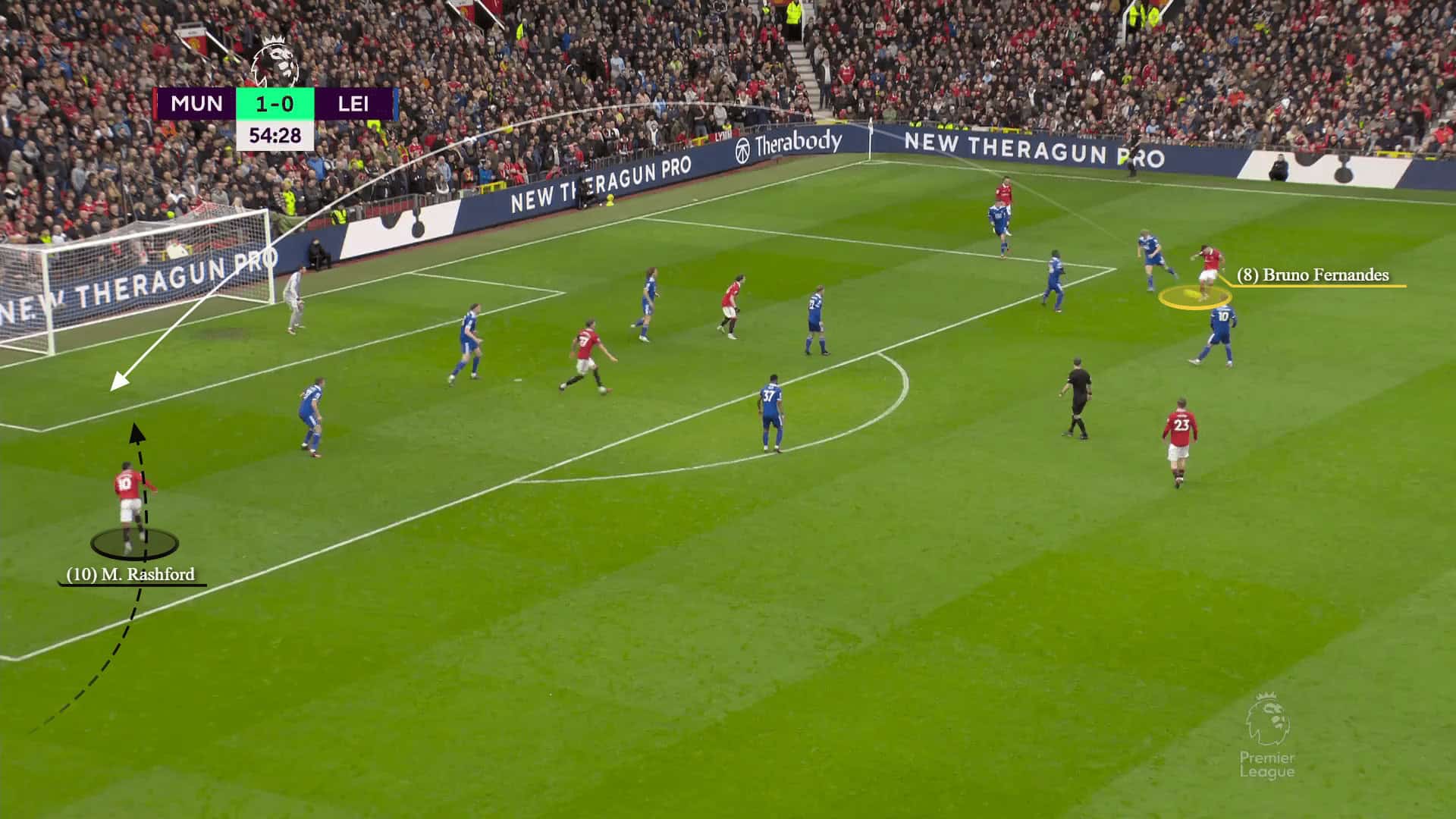 — and then Bruno cuts inside and targets Rashford who runs out-to-in, attacking Castagne’s blindside, gaining the dynamic advantage, yet the ball missed him.