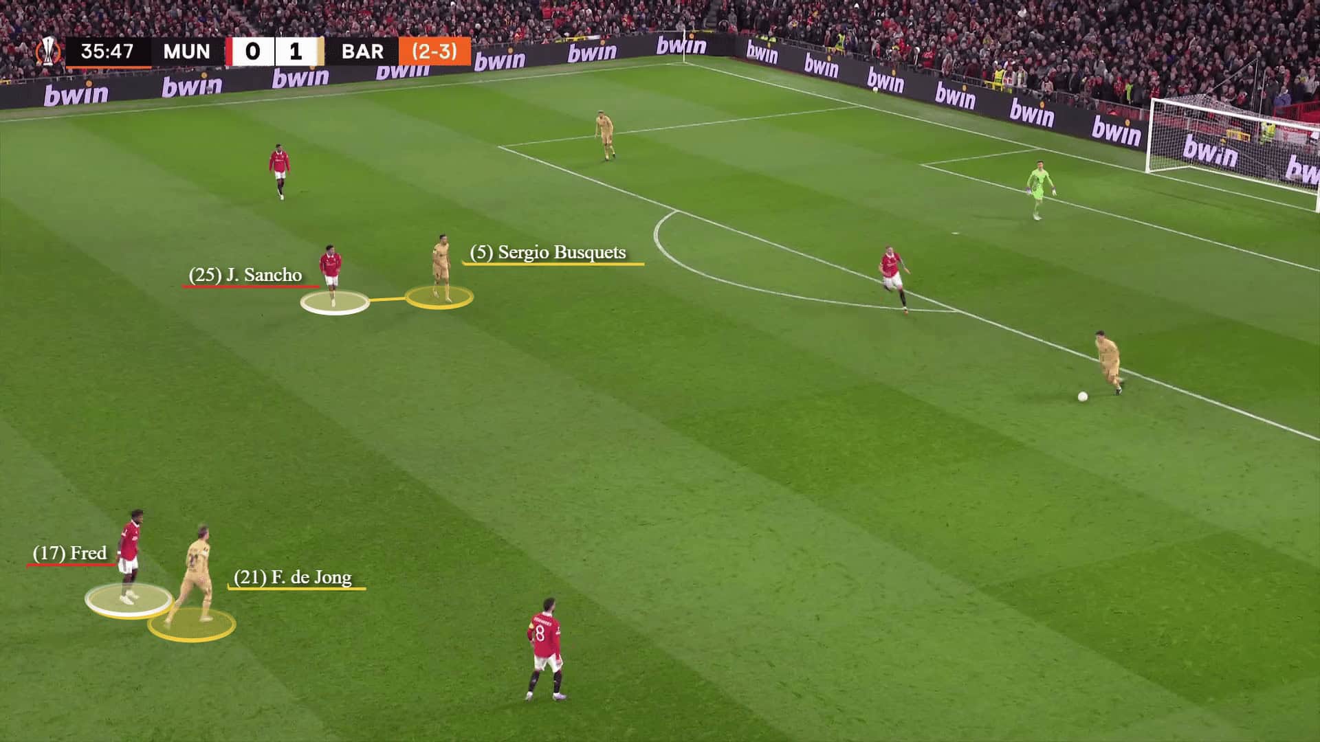 Accordingly, it was essential to press De Jong and Sergio Busquets carefully; thus, Fred was on the right most of the time, encountering and marking De Jong, and Sancho was there to mark Busquets.