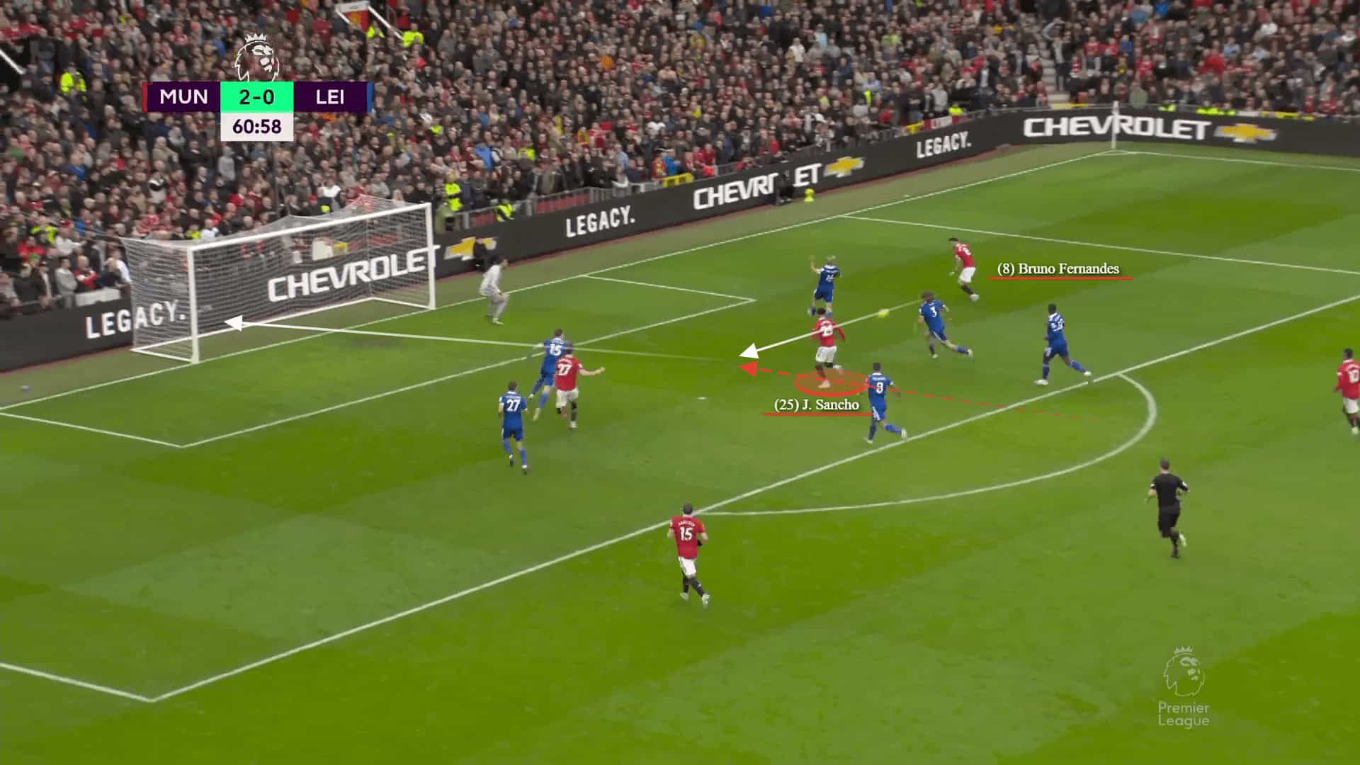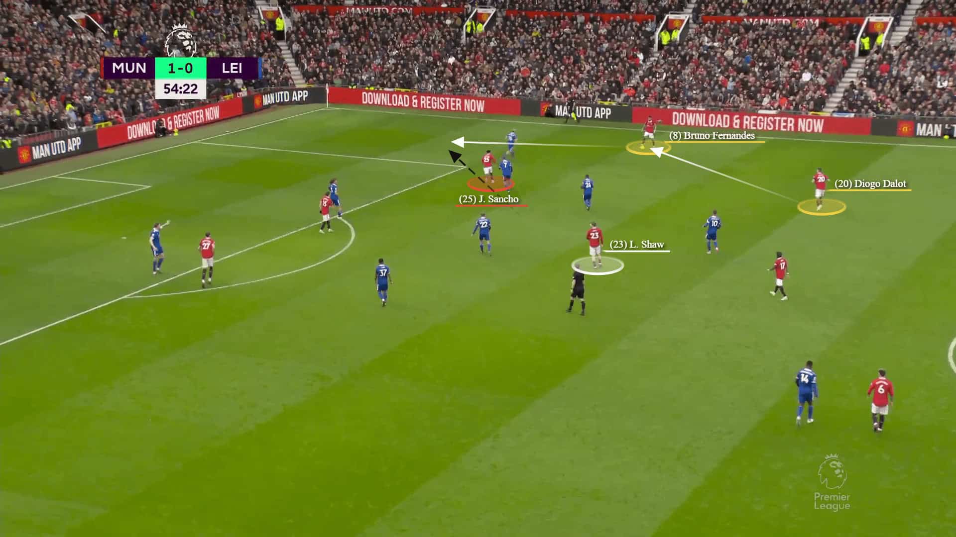 In the final third, having Bruno on the left means more vertical through passes to Rashford, while Sancho continues his deep-lying runs from the opposite half-space where the opposition has no time to react.