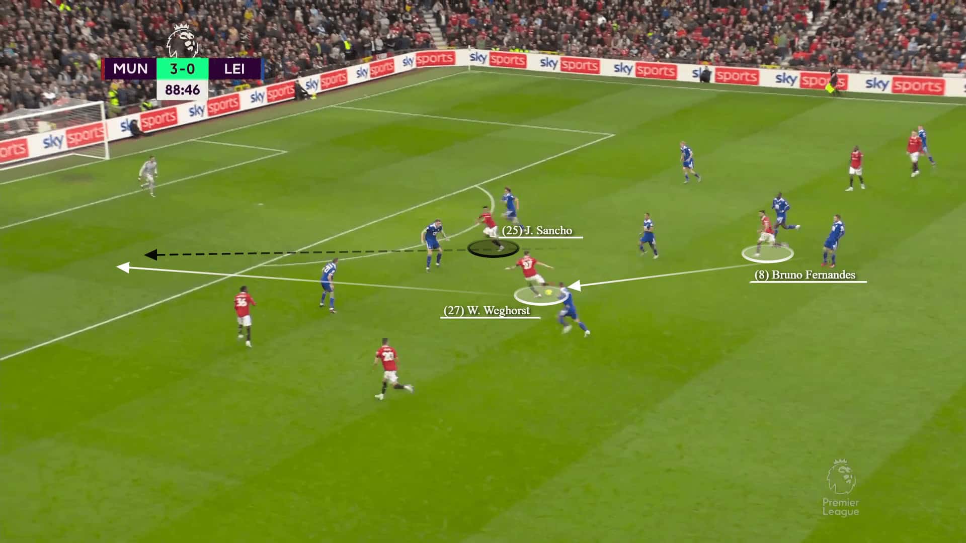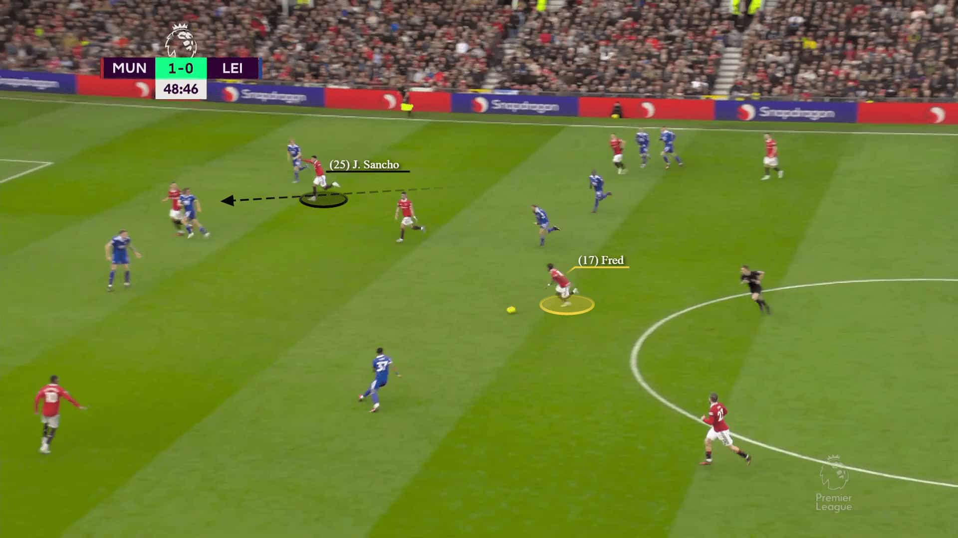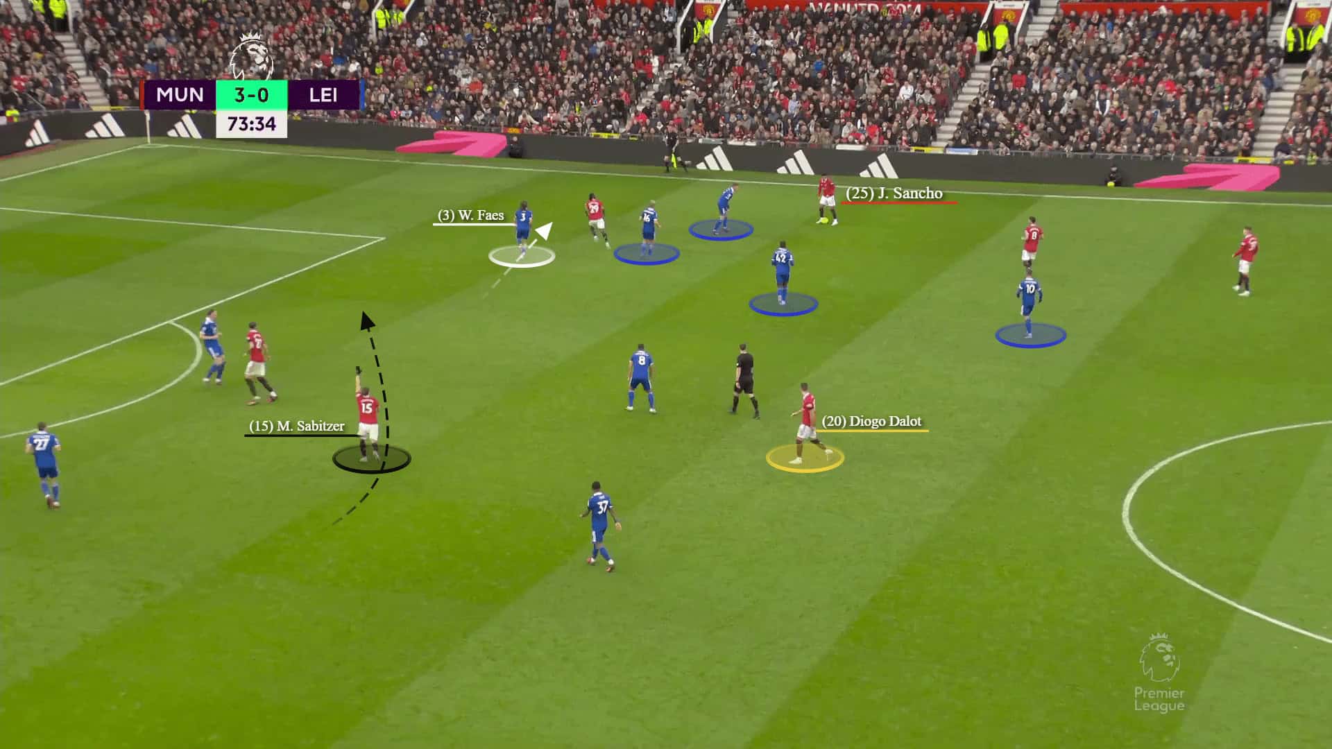 For Sancho’s goal against Leicester, after excellent proactivity from Lisandro Martínez and success to regain the ball from Daka in the centre, Rashford started the transition.