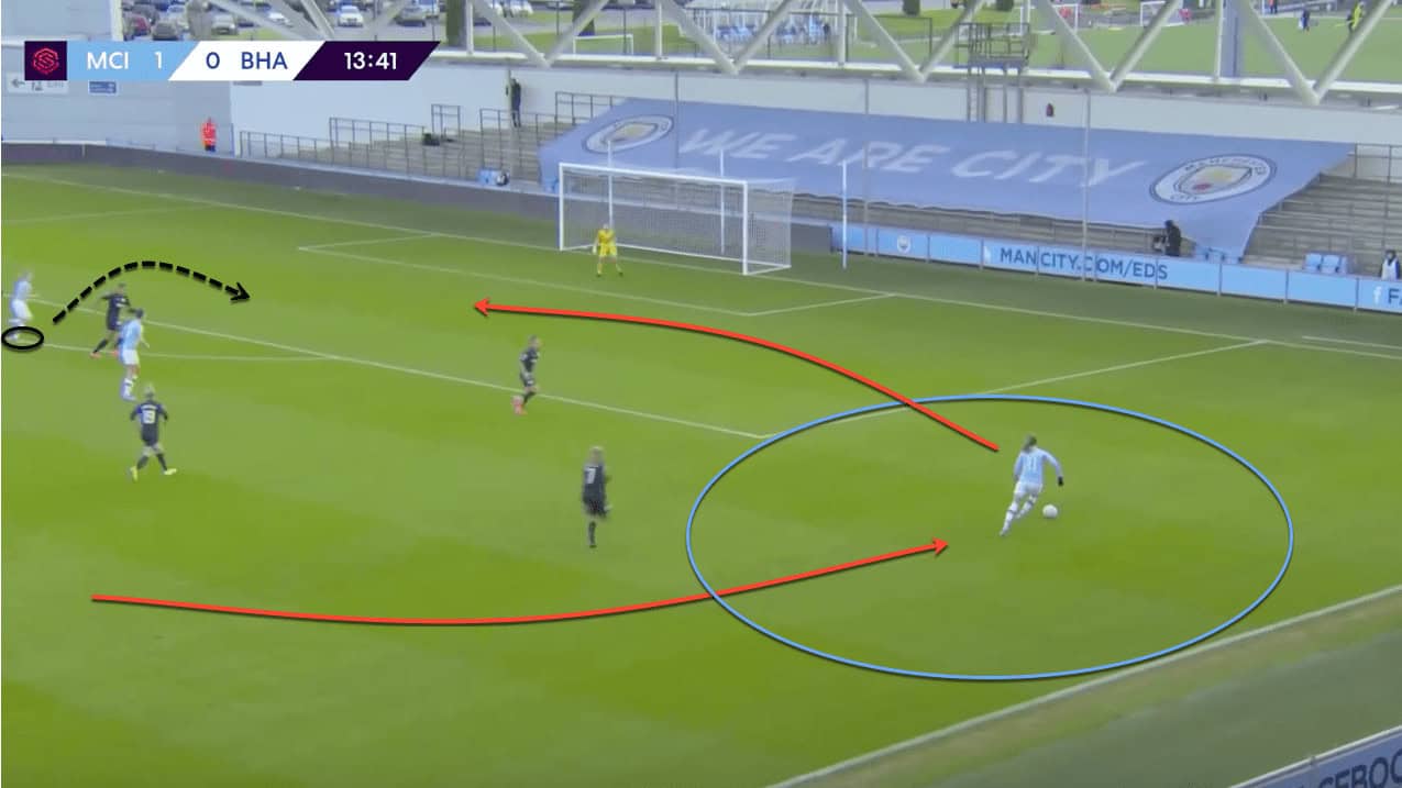 Below you are able to see another example of Beckie’s dynamic position she has taken. Possession has quickly been shifted from the left side of the pitch into Houghton in the heart of defence before this image. The City captain then picks out Beckie who has drifted into a right-wing position to take advantage of the space Brighton & Hove Albion Women have left vacant. This area is so often exploited by the right-back because sides will switch off in this position due to the lack of a right-winger occupying this space. Defenders drift inwards to help deal with the overloads City are trying to create in the middle of the pitch. Beckie then produces a brilliant cross into the feet of White, who finishes with ease behind the defensive line.