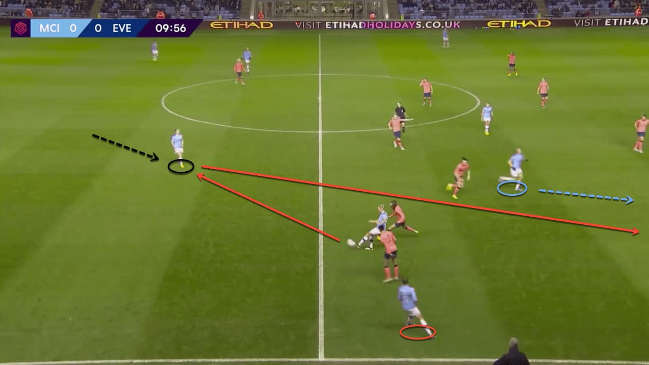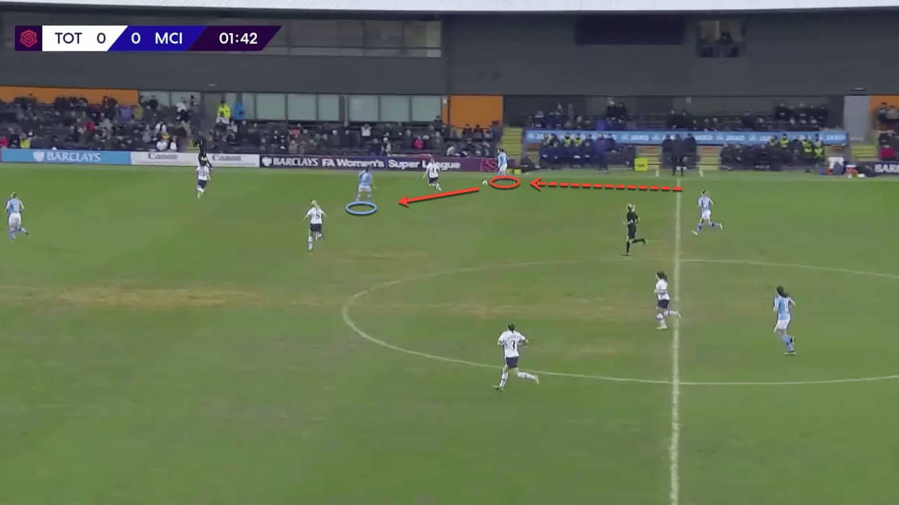 Stanway drops in to receive the pass, before dropping it into Walsh who Everton Women have left completely unmarked. Bremer acknowledges the space in behind the defensive line due to Stanway’s drop into the midfield area and bursts forward into the space. Walsh is able to make a first-time pass through the Everton defensive lines and City are able to generate a chance at goal.