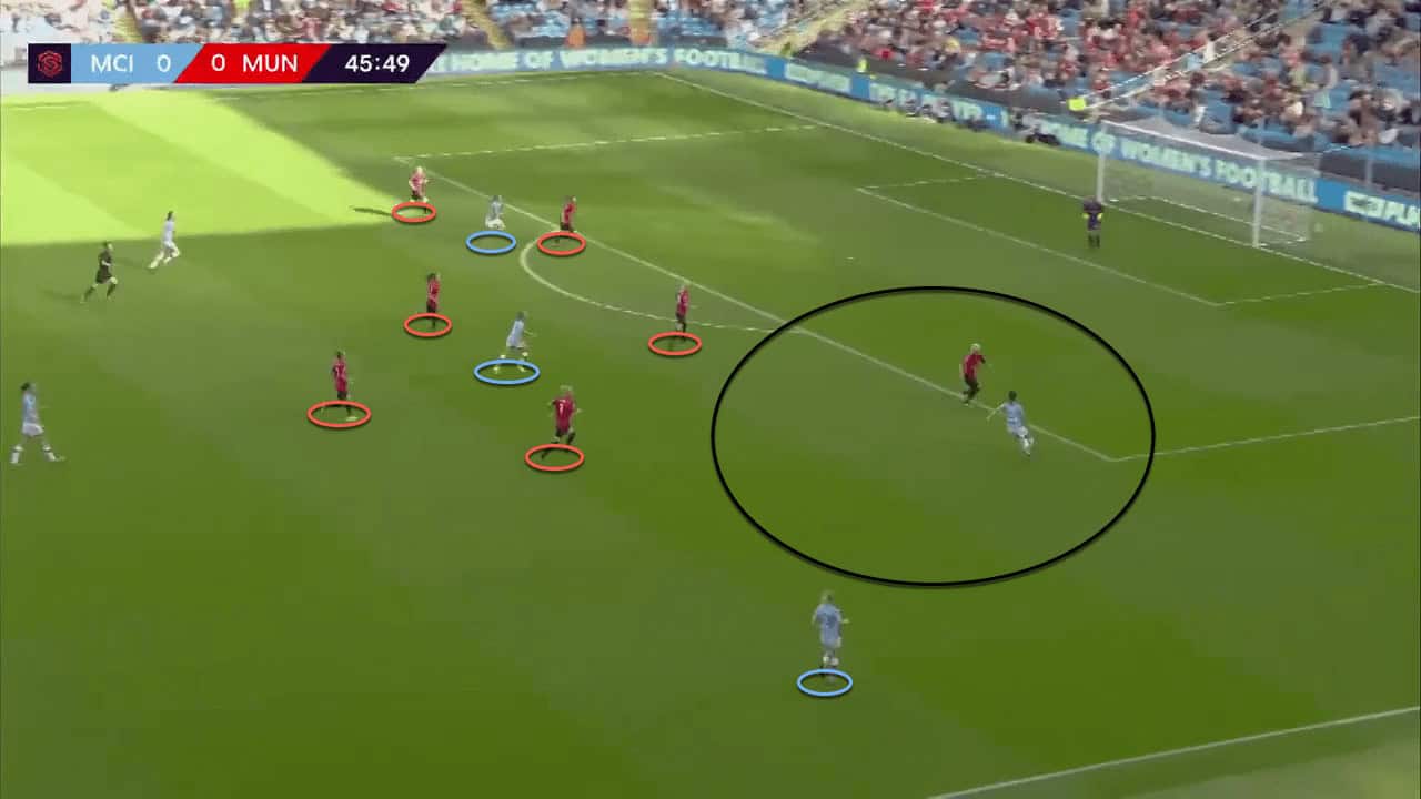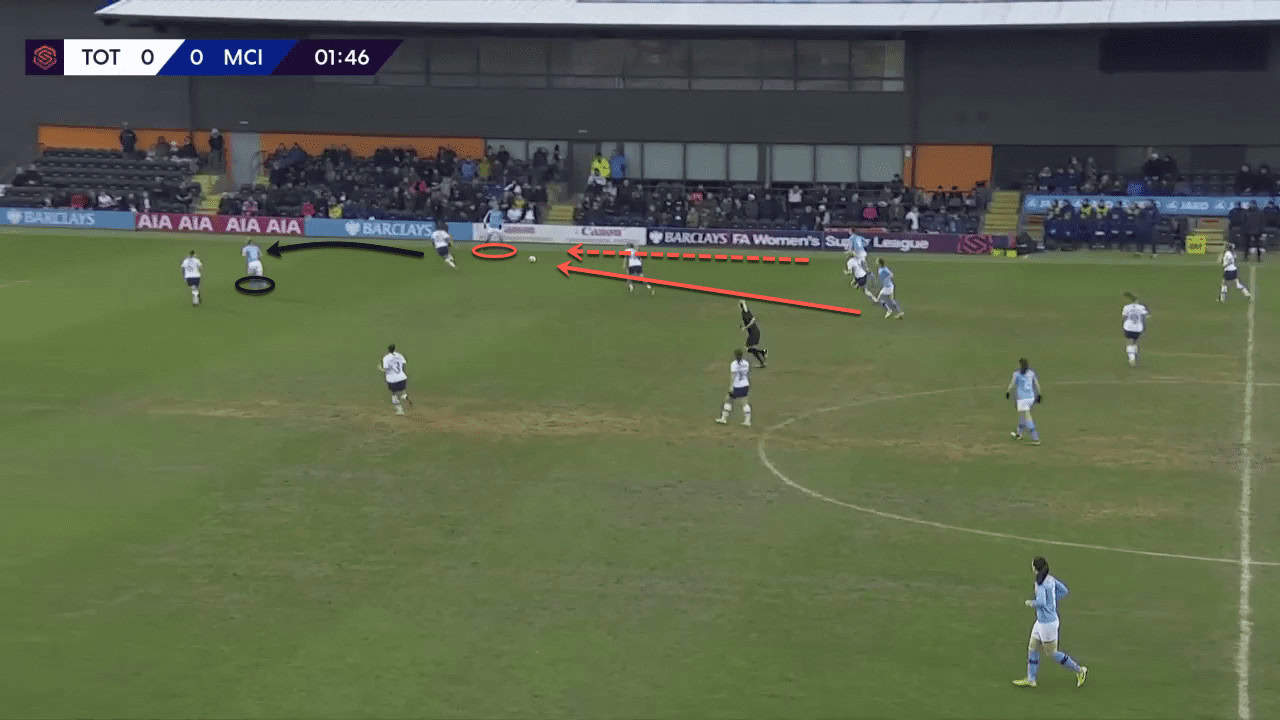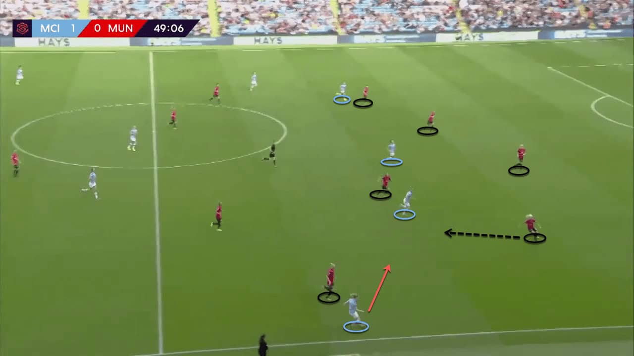 Another example can be seen below of City in possession during this match. As Mannion works play forward down the right side, she is left with very few options as she is being closed down by her marker. Ahead of her, you can see the numbers United have back in defence to deal with City’s attack. In this situation, the United left-back reads the intended pass into the winger’s feet and intercepts it easily.