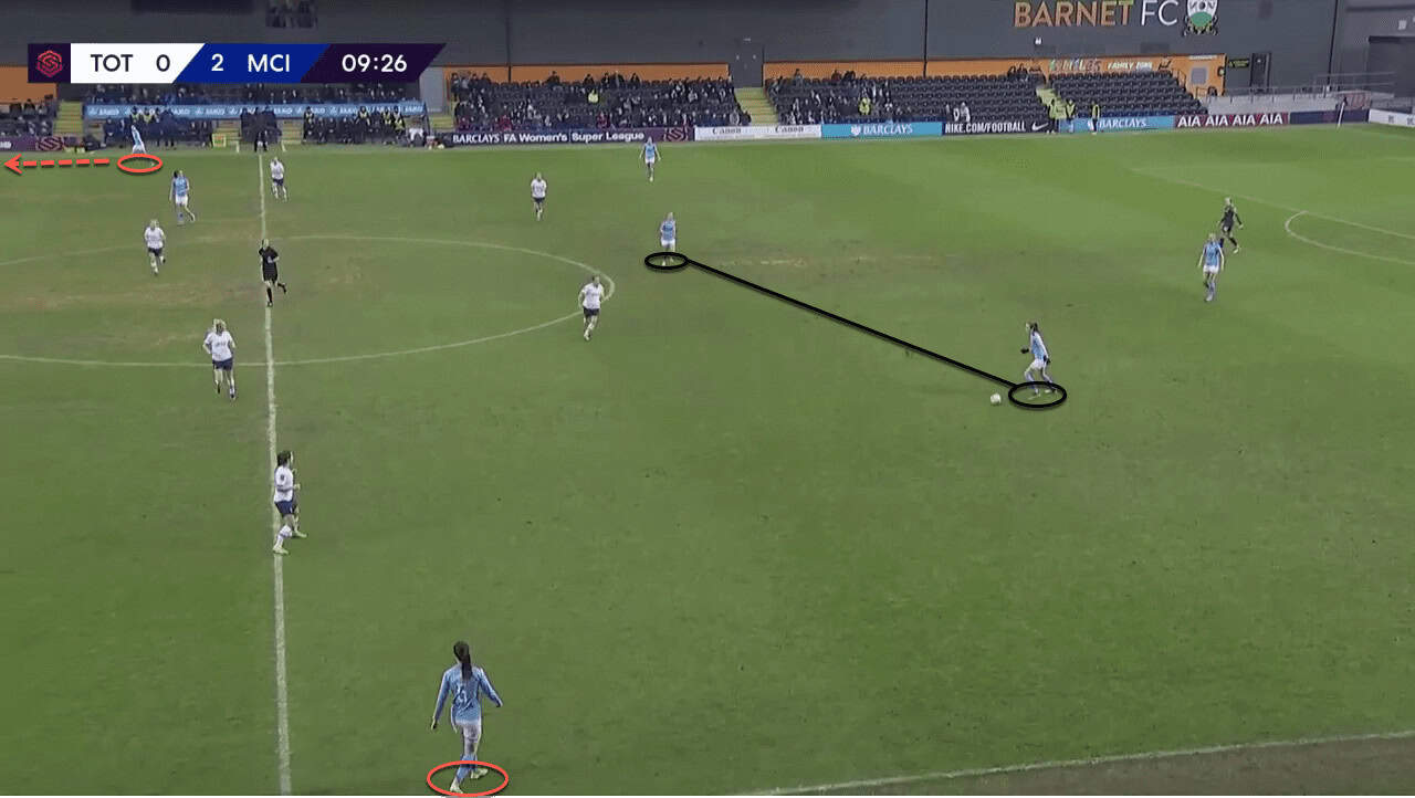 Another tactic we have yet to discuss is the role of Scott (8). With Weir’s deeper positioning in the centre of midfield, Scott has been given more freedom to move forward up the pitch. The duties she does take on have to do with linking up with Beckie in wide areas. Because of the absence of a right-winger, Scott has often taken a position closer to this area of the pitch, as you can see above. This provides a link between Beckie and the side, and also allows City to have the potential to combine quickly in this area.