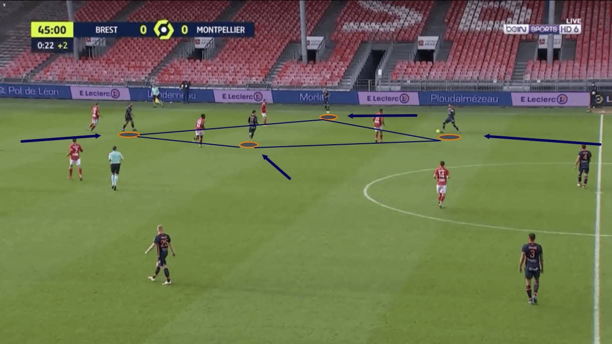 A Der Zakarian side will defend in the mid-block, engaging at around the halfway line. We see an example of this from 2020/21 in figure 1. The opposition, again ironically Brest, were allowed to play to the halfway line with little-to-no pressure on the backline. Montpellier’s defensive block shifted backwards, retaining compactness between the lines and discipline to continue protecting their designated zone, not jumping out and sacrificing the defensive system’s solidity.