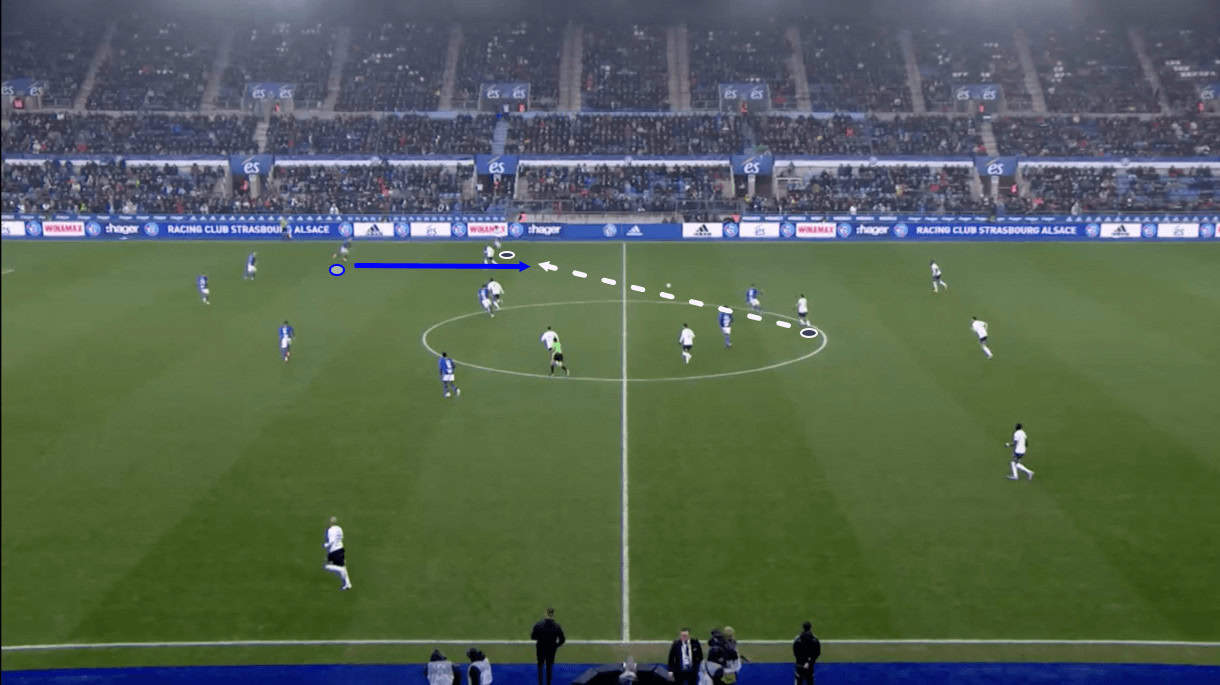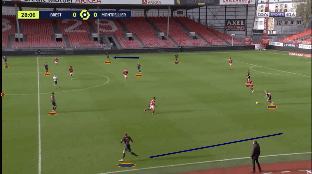 At times, they’ve been too easy to play through as a result of this, for instance, in their last game under Piteau, Montpellier pressed high against the opposition’s backline quite a bit, but Strasbourg were comfortable playing the ball around the back, coping with the pressure and finding an opportunity to play over Montpellier’s press, beyond the midfield, dropping the ball in front of La Paillade’s backline, hence putting the backline under a lot of pressure as they get exposed by the further forward players’ inability to stop the opposition making their way through them.