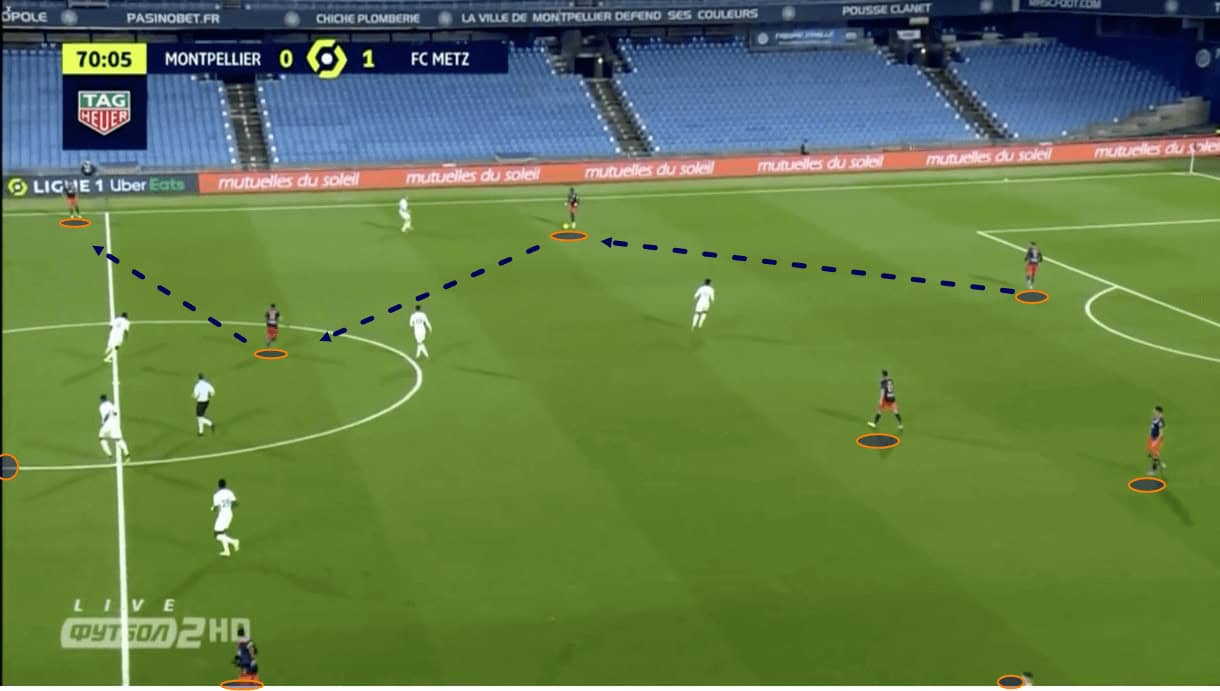 Figure 4 helps to illustrate how these wide men always tried to make themselves a viable option for the deeper player looking to move the team forward. Indeed, they had an offensive role in which they looked to get forward but primarily, they ensured they didn’t break that link between themselves and the centre-back/goalkeeper. Primarily, they remained available to them. We can see how this helped Montpellier slice through their opponents in figure 4. The positioning of the full-back stretched the opposition, allowing the full-back to use the central midfielder who could enjoy some space to receive and then quickly play the through ball into the opposition’s half.
