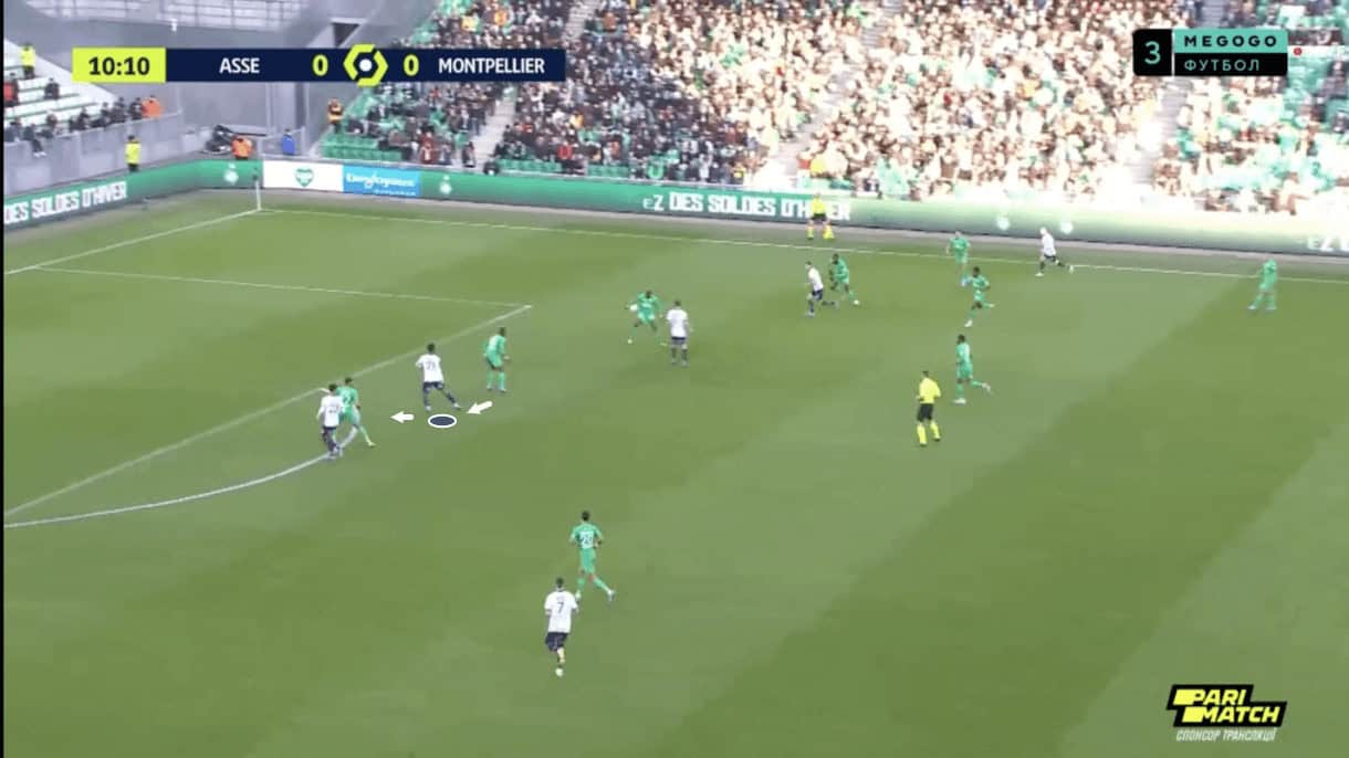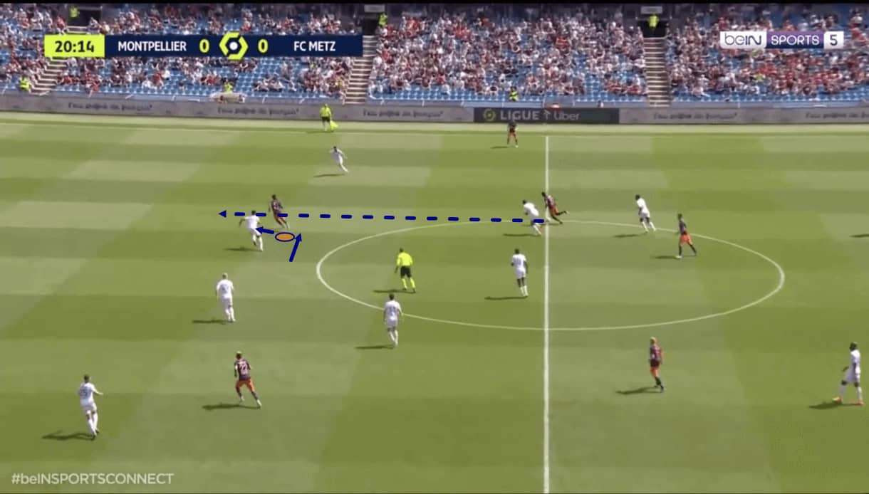 This season, Montpellier’s wide men have failed to keep that link to the deeper ball carrier intact quite often, resulting in cheap, dangerous ball losses as we see in figure 5. Here, the wide man was running forward but didn’t pay enough attention to the pass coming from midfield; he focused too much on getting forward and not enough on maintaining the link to the deeper player. As a result, he failed to receive the ball as the opposition intercepted and drove forward to attack Montpellier’s weakened (as a result of the team losing the ball with the full-backs sent forward) backline.